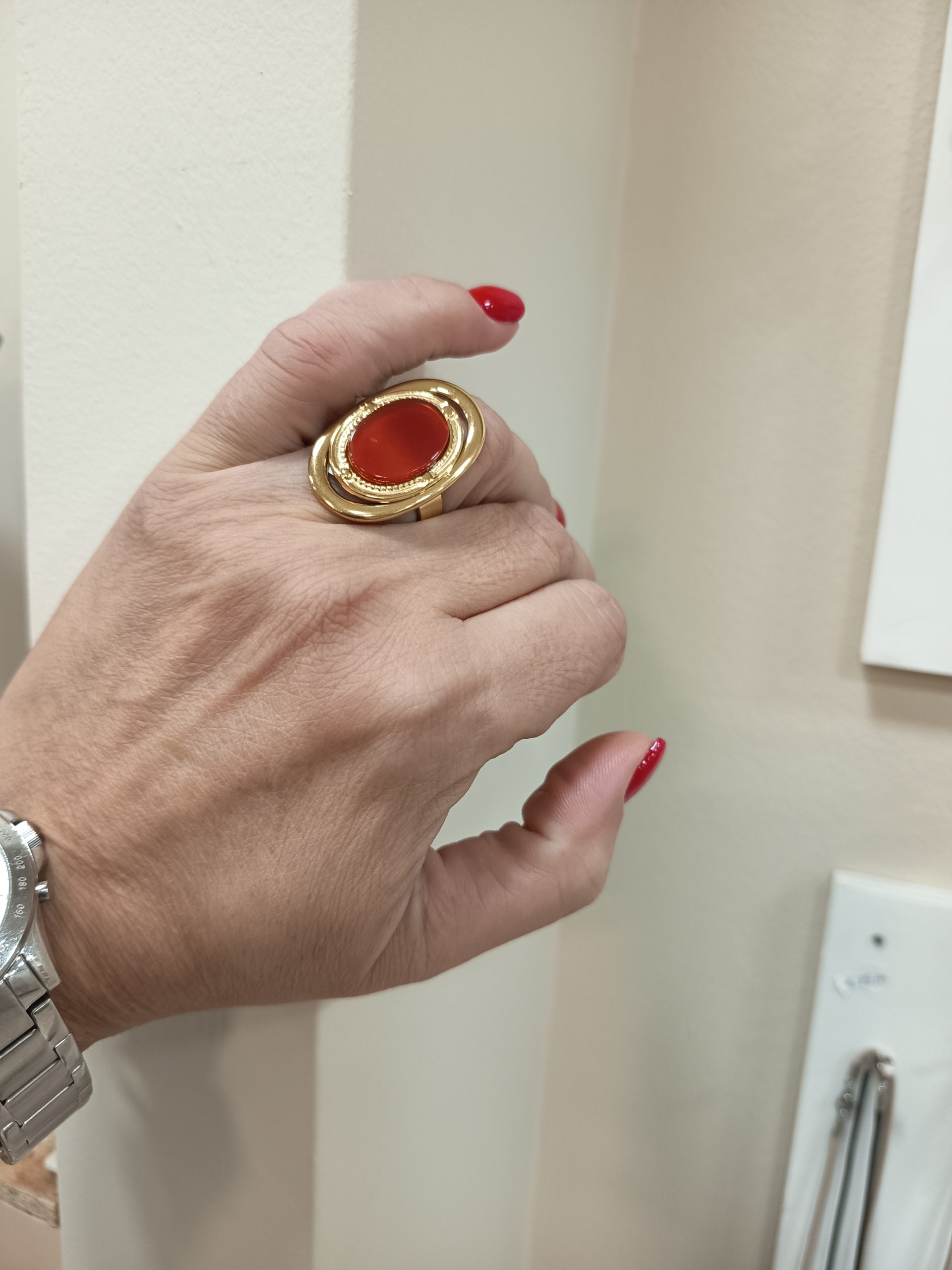 Upgrade your style with this distinctive stainless steel statement ring, highlighted by its unique design and the vibrant red cabochon carnelian stone at the center.