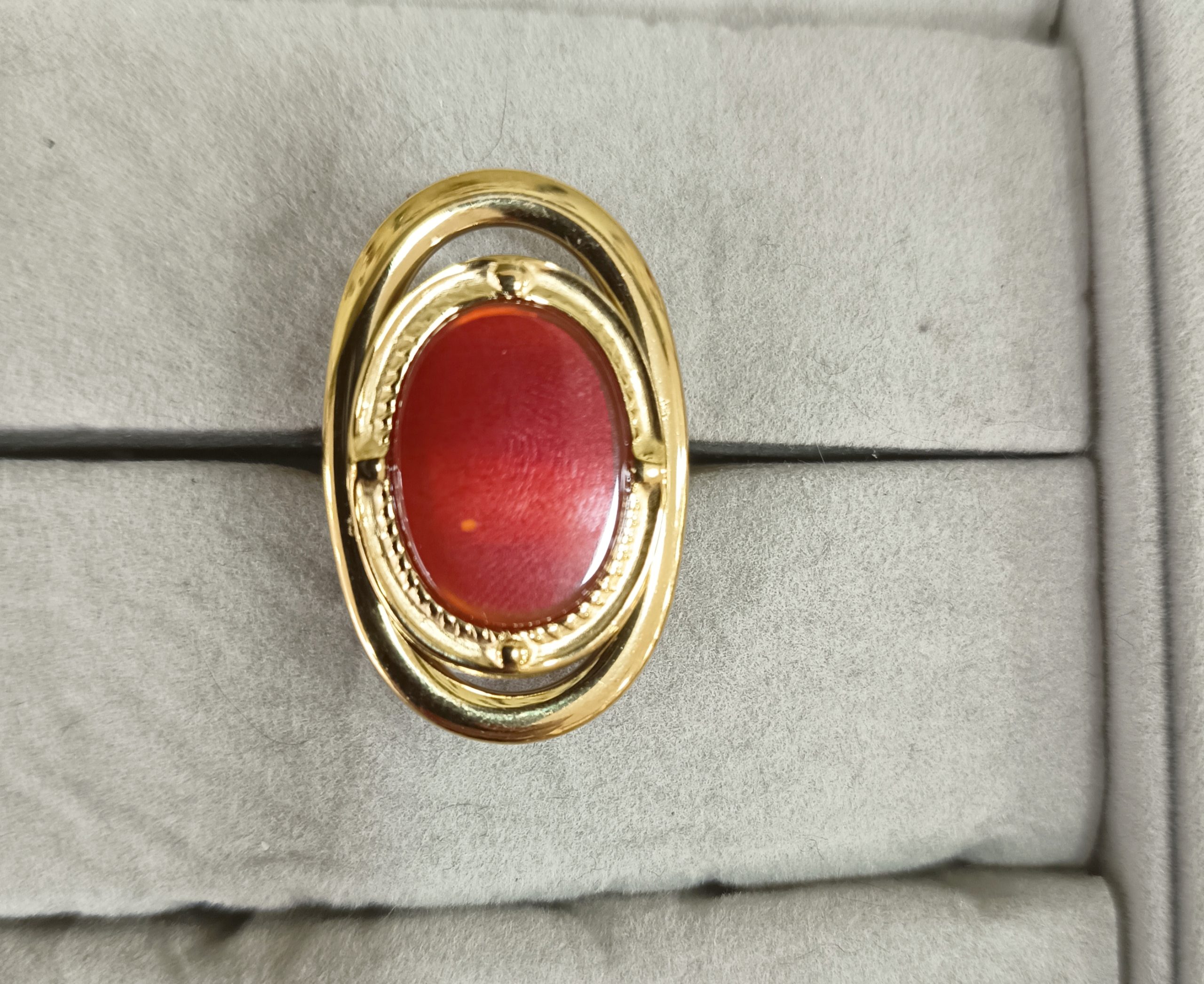 The oval stone in a deep red shade adds character and elegance, while the gold-tone stainless steel offers durability and timeless shine.