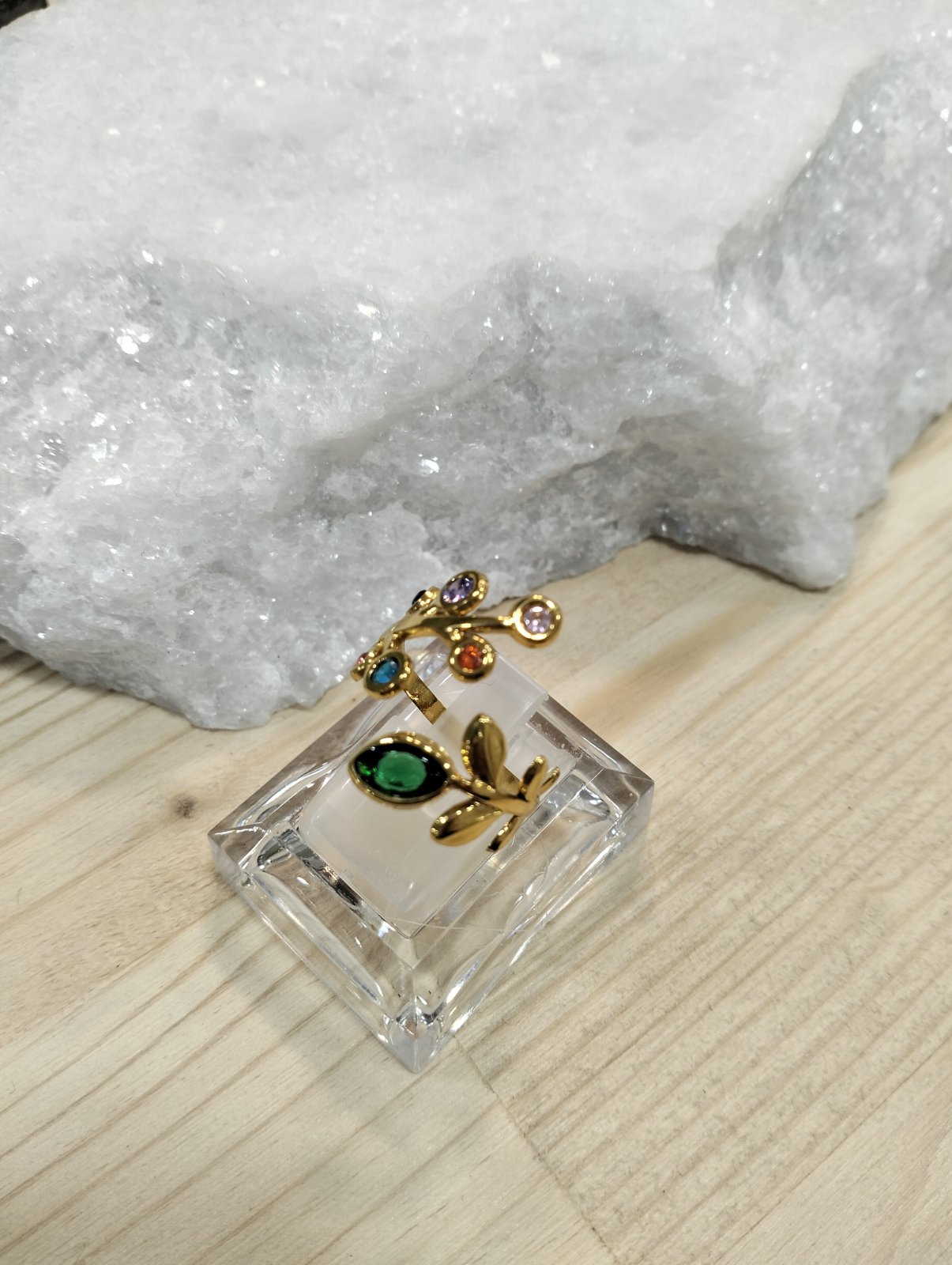 Adjustable stainless steel ring featuring a leaf and branch design, adorned with multicolor stones. A unique piece that blends natural inspiration with modern style.