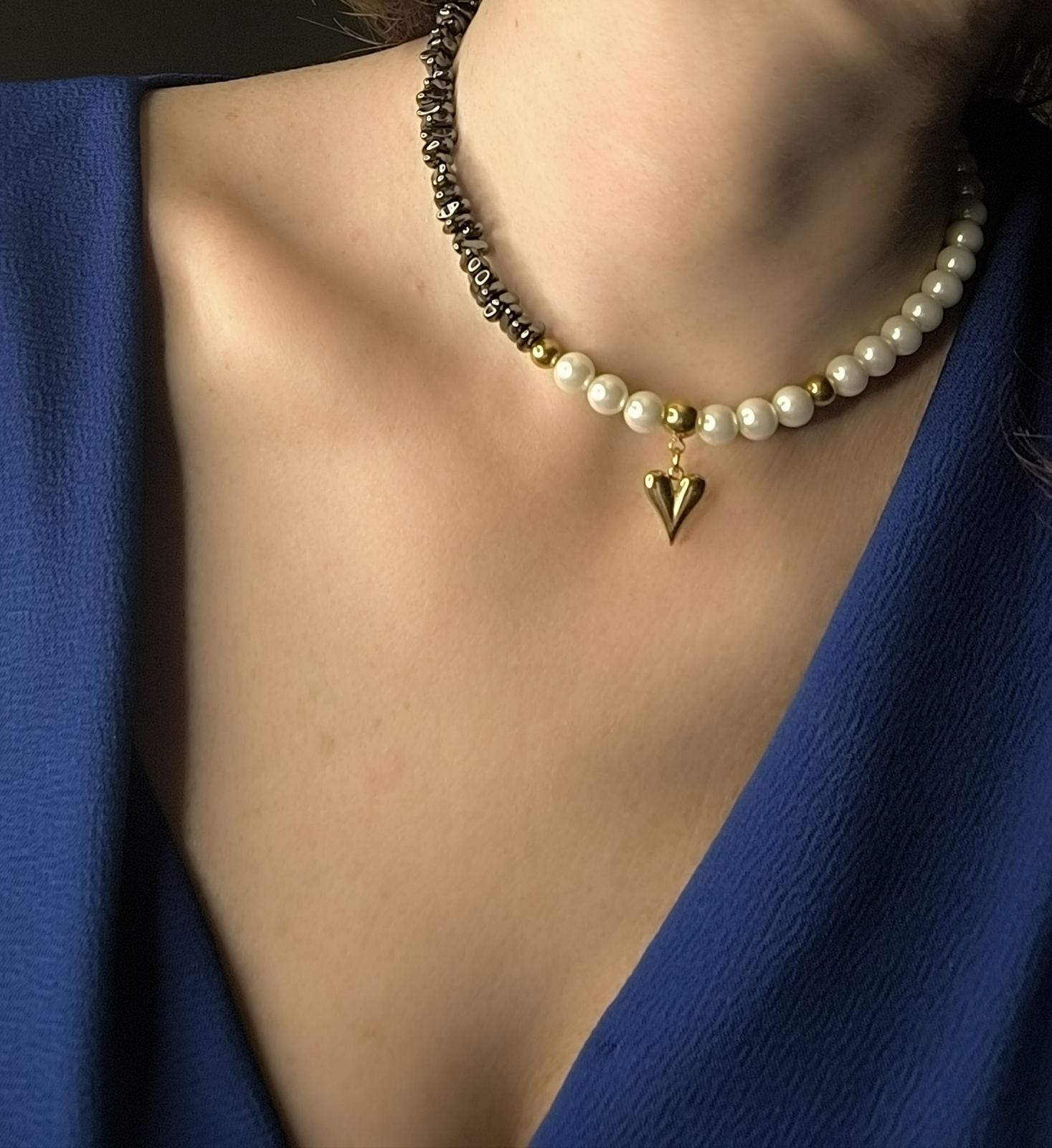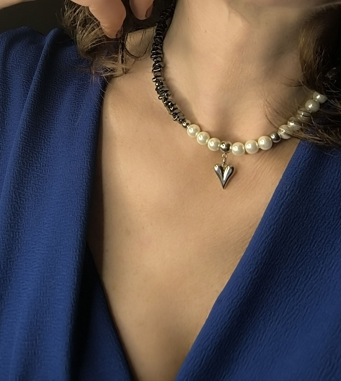 The handmade hematite and pearl necklace – Black Pearl Heart stands out from the very first moment. The irregular black hematite adds a bold and modern touch. At the same time, the white pearls bring elegance and balance.