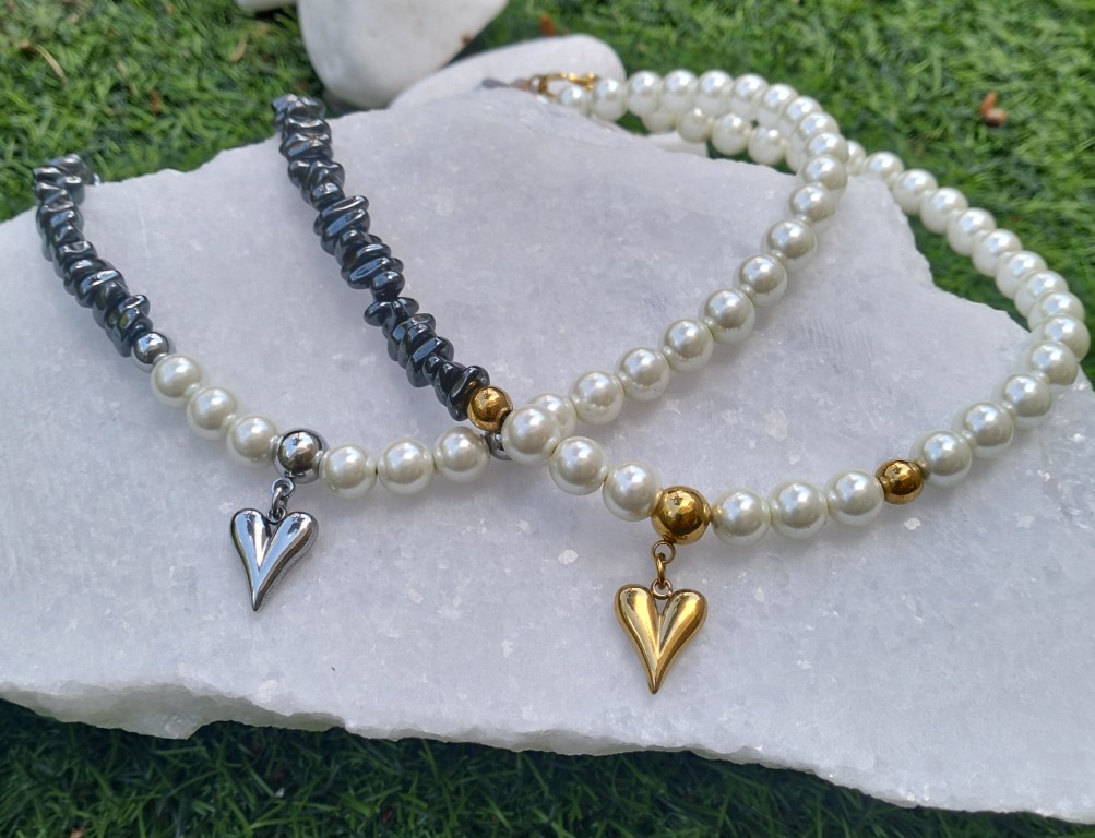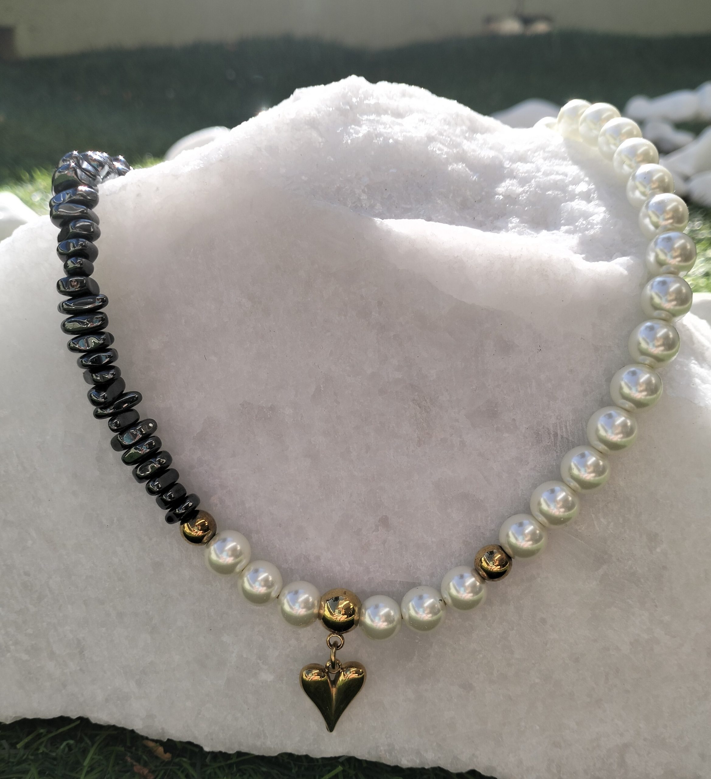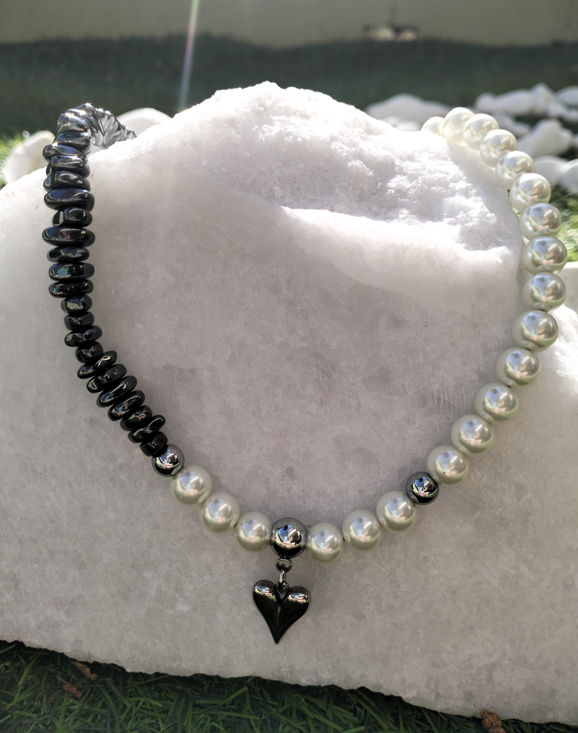 Handmade hematite and pearl necklace – Black Pearl Heart