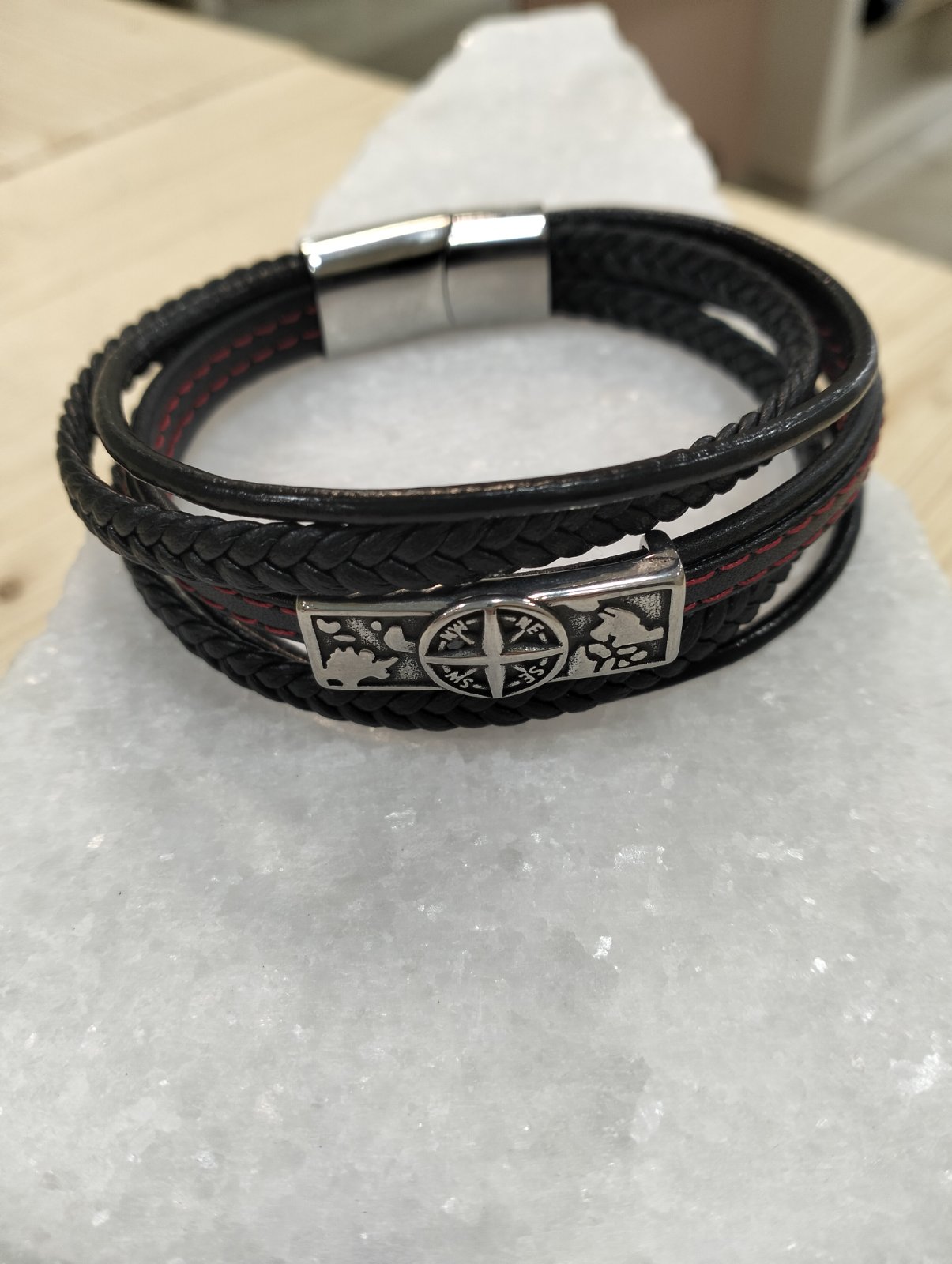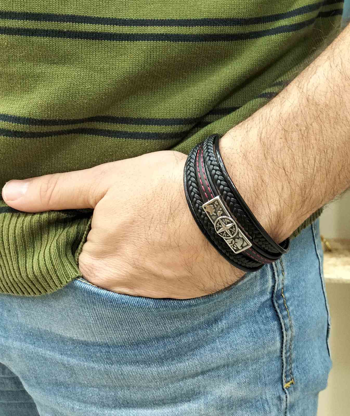 Ανδρικό βραχιόλι από δερματίνη με πλεκτά κορδόνια και μεταλλική πλάκα με σχέδιο πυξίδας από ανοξείδωτο ατσάλι. Διαθέτει μαγνητικό κούμπωμα για εύκολη και ασφαλή εφαρμογή στον καρπό.