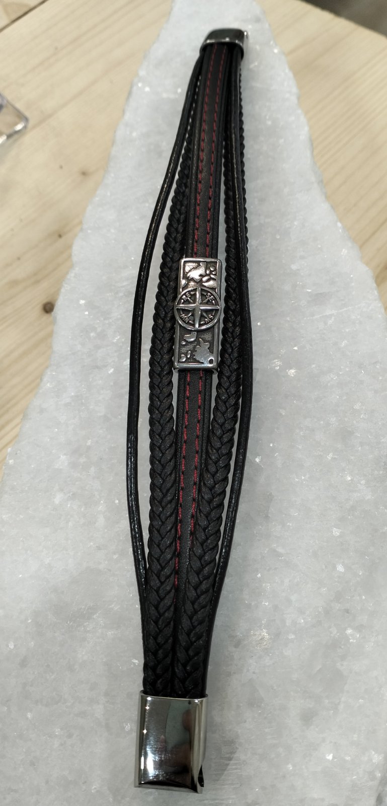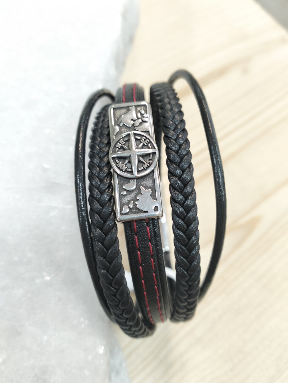 Ανδρικό βραχιόλι με μοντέρνο σχεδιασμό που συνδυάζει δερματίνη και ανοξείδωτο ατσάλι. Τα πλεκτά κορδόνια δίνουν ιδιαίτερο στυλ, ενώ η μεταλλική πλάκα με σχέδιο πυξίδας προσθέτει έναν δυναμικό χαρακτήρα στο κόσμημα.