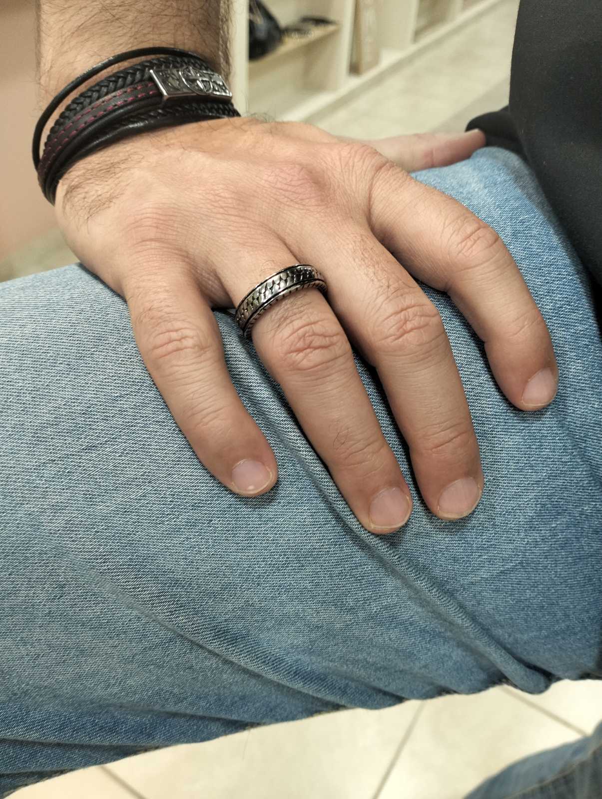 Κομψό ανδρικό δαχτυλίδι τύπου βέρα από ανοξείδωτο ατσάλι με σχέδιο αλυσίδας περιμετρικά. Το ιδιαίτερο μοτίβο δίνει στο κόσμημα ένα μοντέρνο και διακριτικά δυναμικό ύφος, ιδανικό για καθημερινή χρήση.