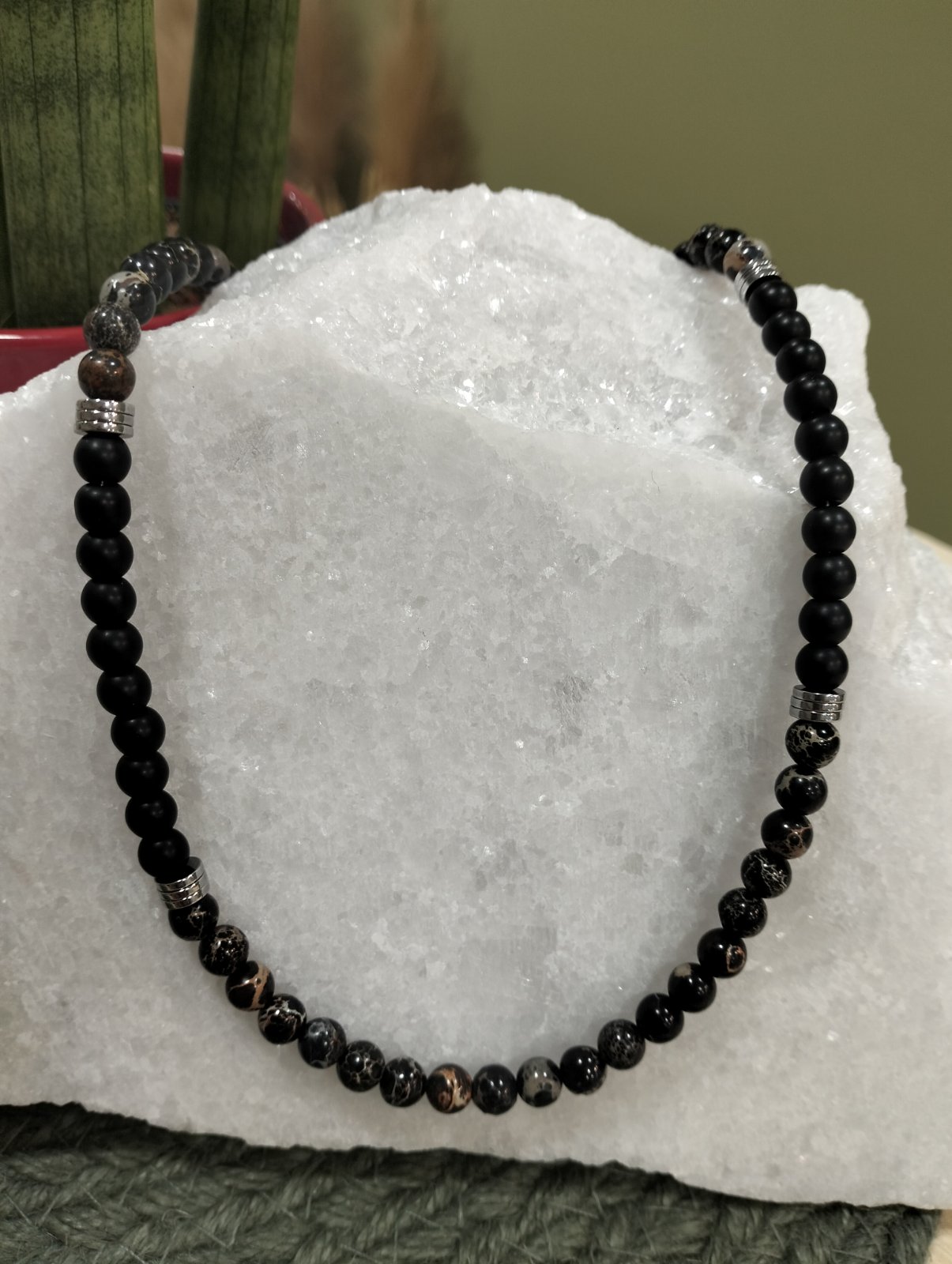 Το Atlas είναι ένα minimal ανδρικό κολιέ, κατασκευασμένο από ημιπολύτιμες χάντρες διαμέτρου 6mm, με ενδιάμεσα στοιχεία αιματίτη 6mm που προσδίδουν διακριτική λάμψη και μοντέρνο χαρακτήρα. Το ατσάλινο κούμπωμα εξασφαλίζει αντοχή και άνεση για καθημερινή χρήση.