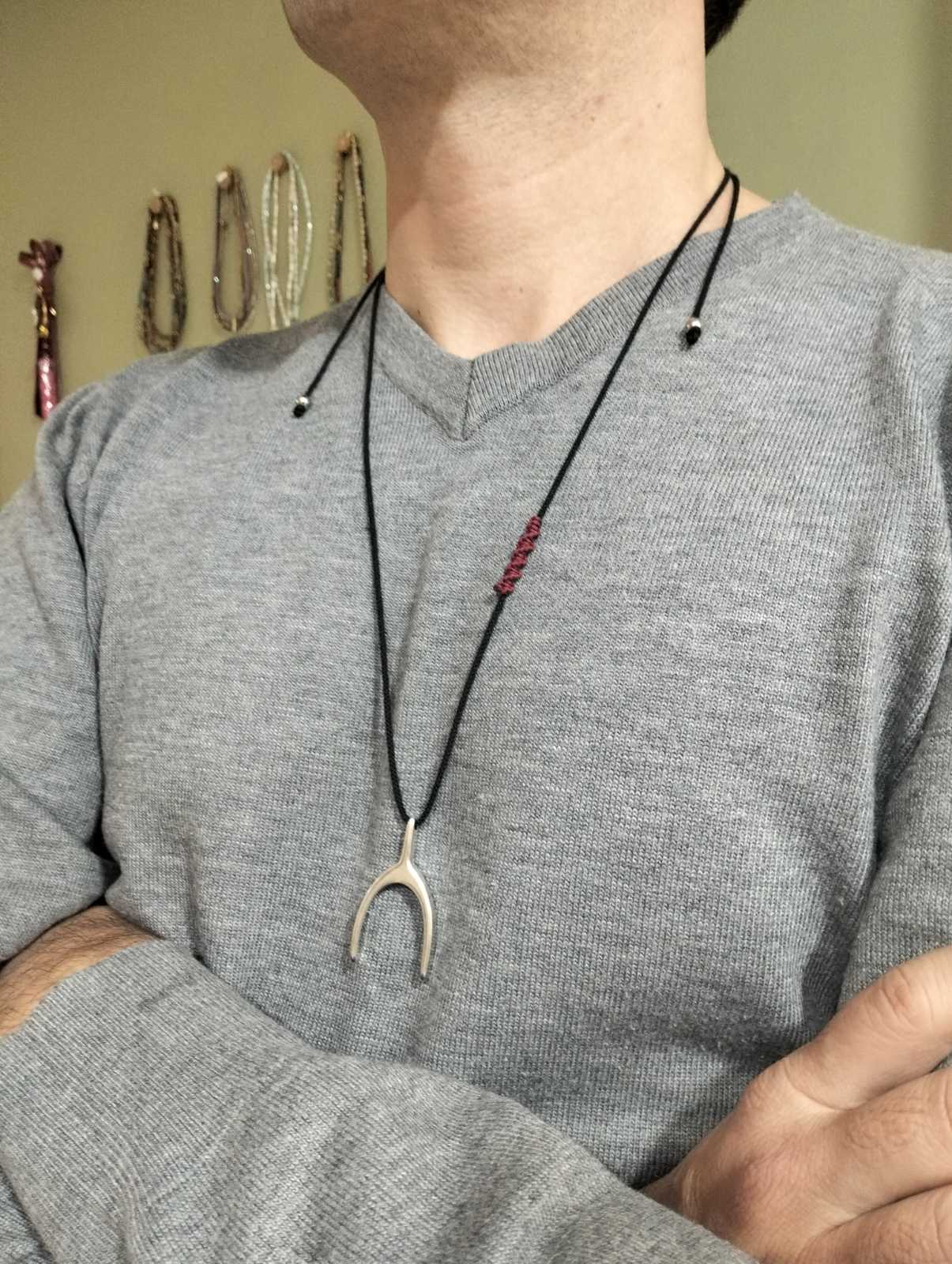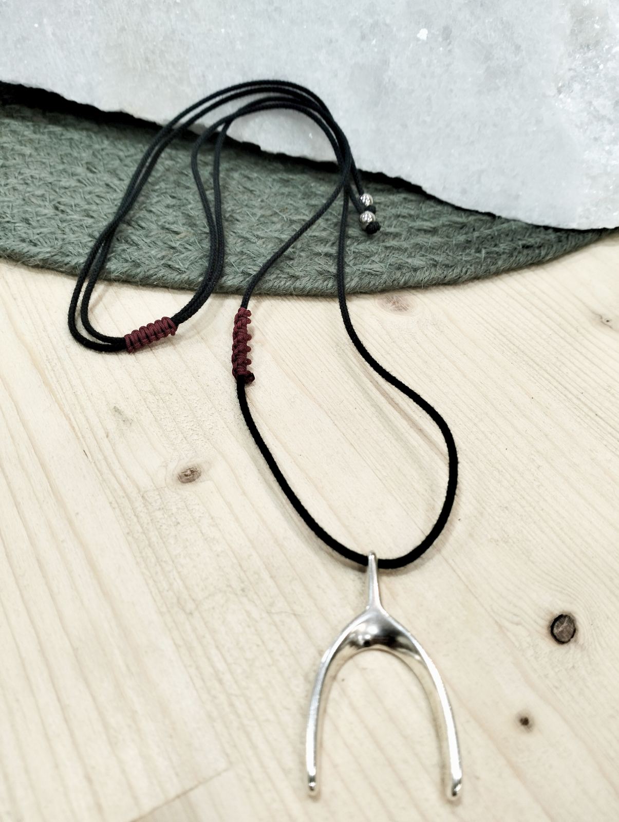 Χειροποίητο κολιέ με μαύρο κορδόνι υψηλής αντοχής και μακραμέ κούμπωμα, διακοσμημένο με κομψά μπορντώ δεσίματα και ατσάλινες χάντρες. Το κεντρικό μοτίφ είναι κόκαλο ευχών από ζάμακ, σε λιτή και μοντέρνα γραμμή, ιδανικό για καθημερινή αλλά και πιο ιδιαίτερη εμφάνιση.
