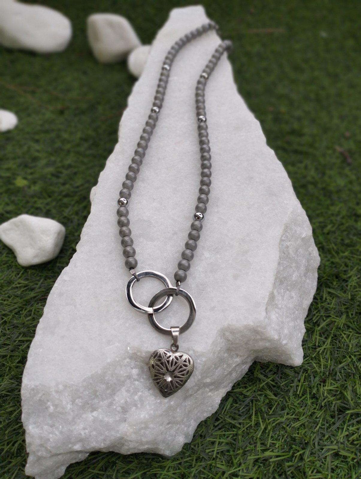 Στο κέντρο του κοσμήματος βρίσκονται δύο ατσάλινοι κρίκοι (36mm) δεμένοι μεταξύ τους, δημιουργώντας ένα μοντέρνο “linked” στοιχείο, ενώ το σχέδιο ολοκληρώνεται με ένα ιδιαίτερο ατσάλινο λευκό μενταγιόν καρδιά, το οποίο ανοίγει (locket).