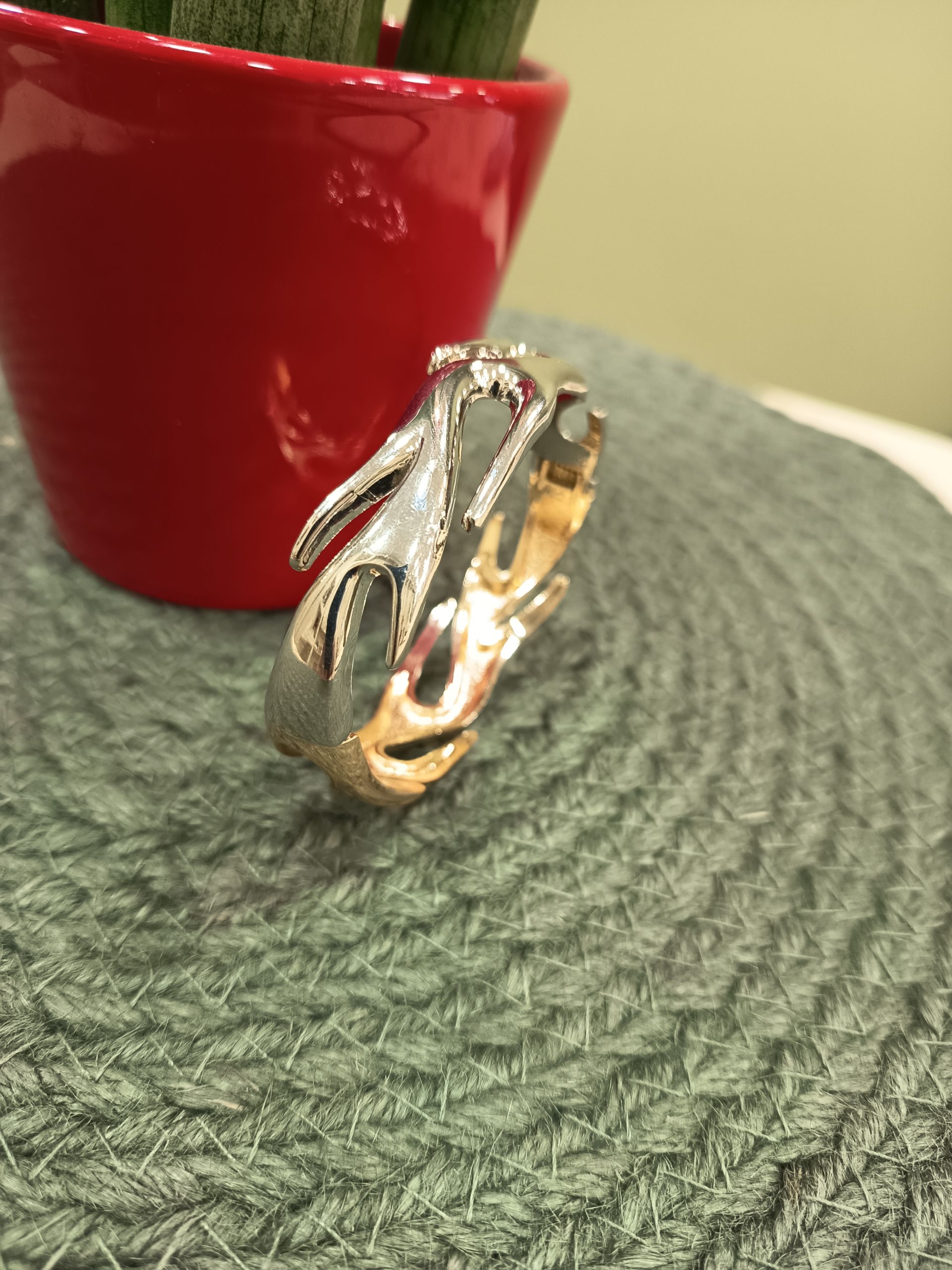Αναβάθμισε το στυλ σου με αυτό το εντυπωσιακό βραχιόλι-Χειροπέδα Φω σε δίχρωμη απόχρωση λευκού και χρυσού, που συνδυάζει τη διαχρονική κομψότητα με τη σύγχρονη αισθητική.