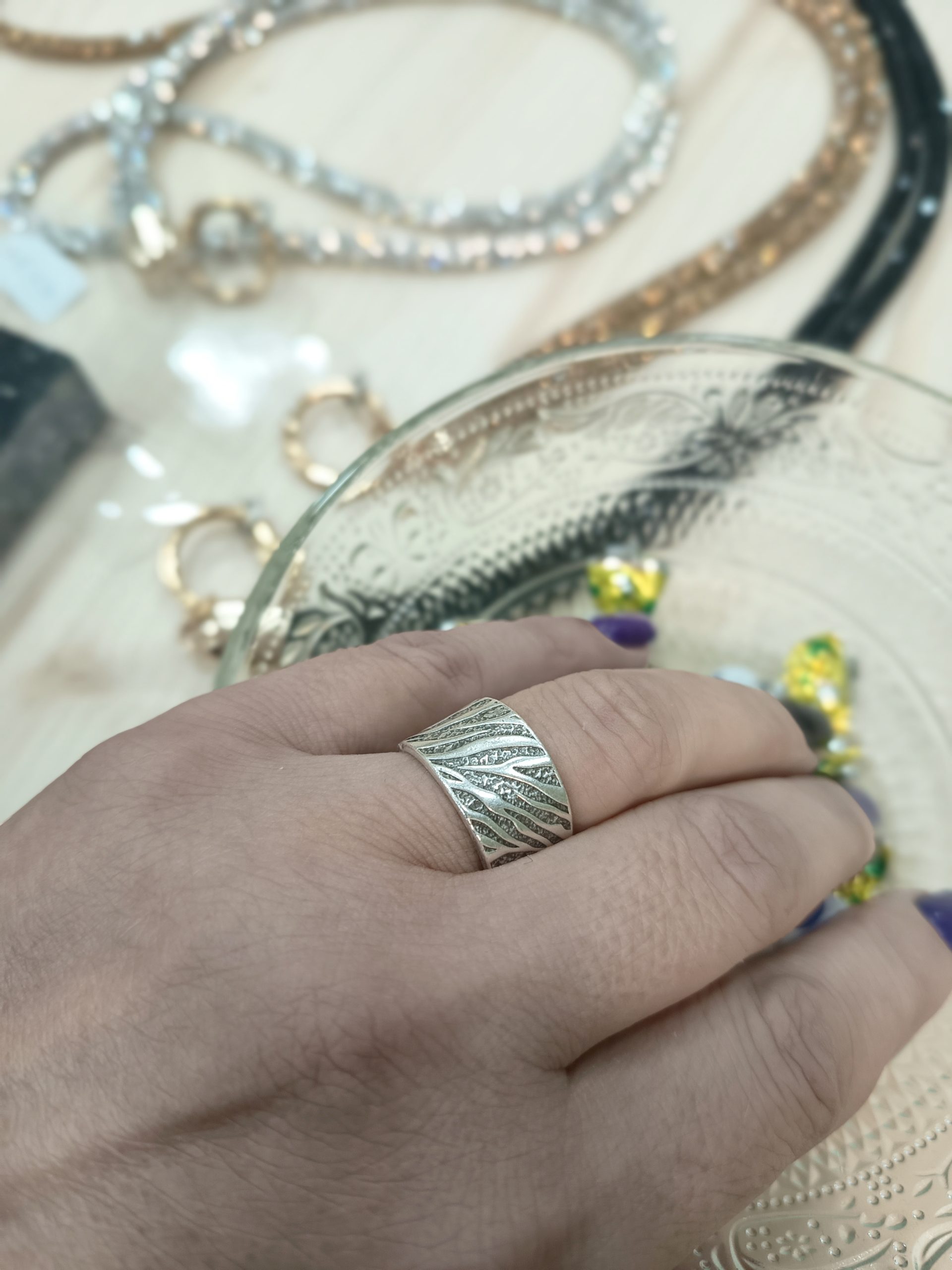 Η σφυρήλατη επιφάνεια δημιουργεί παιχνίδι φωτός και αντανακλάσεων, δίνοντας στο κόσμημα μια “ζωντανή” αίσθηση. Φοριέται εύκολα μόνο του ως statement κομμάτι ή συνδυάζεται αρμονικά με άλλα δαχτυλίδια για πιο layered εμφανίσεις.