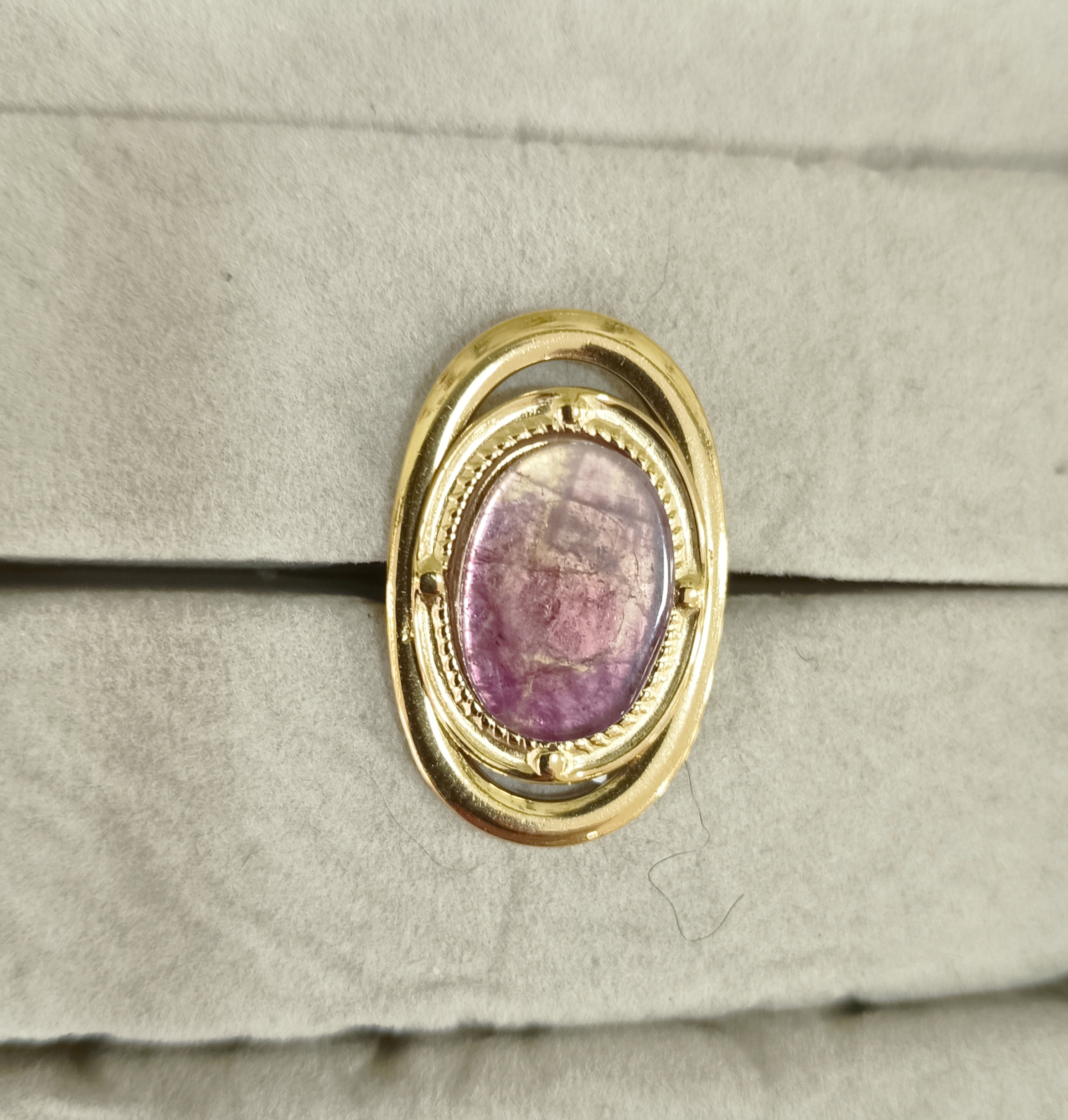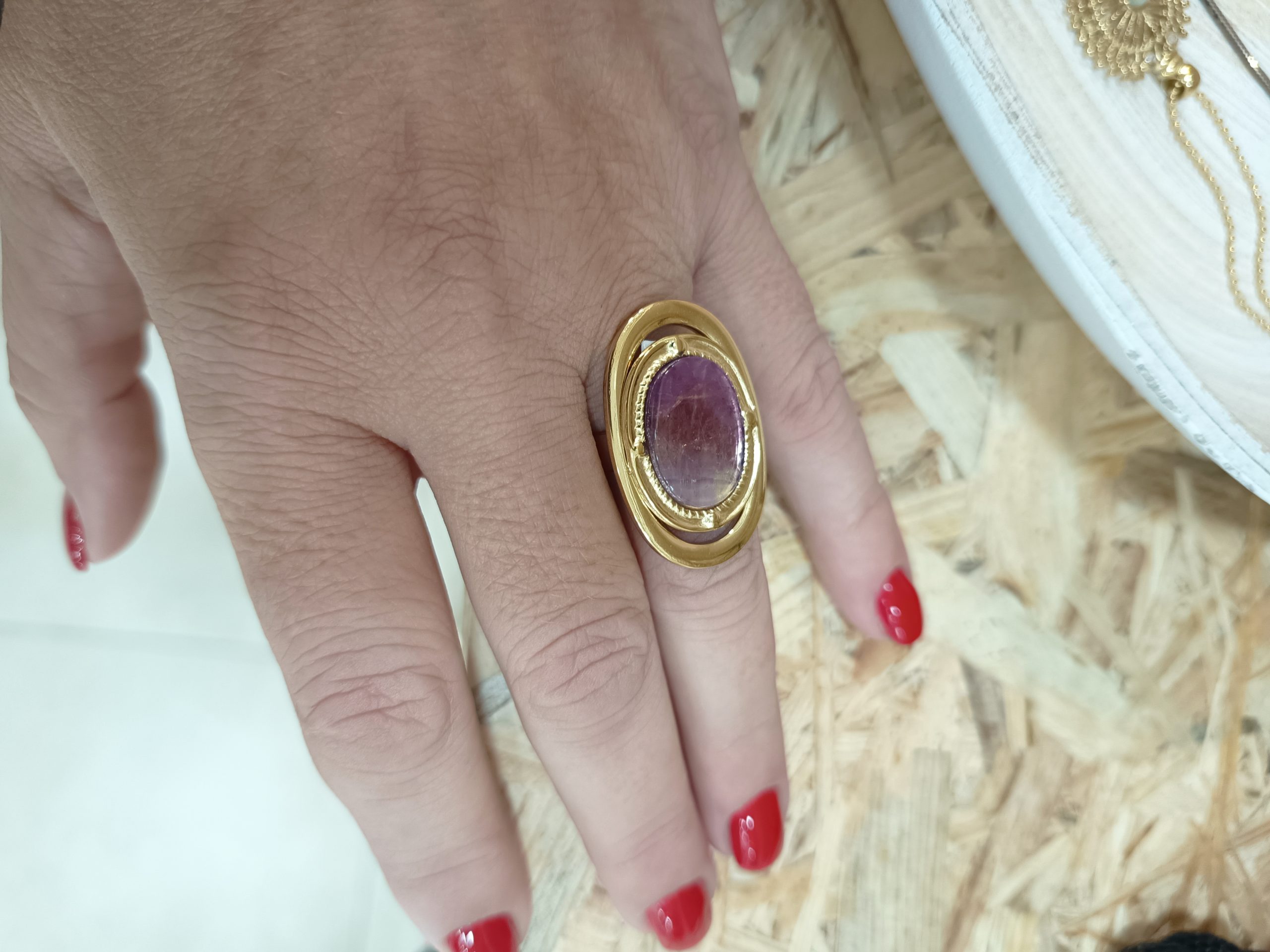 Η οβάλ πέτρα σε βαθιά μωβ απόχρωση προσδίδει χαρακτήρα και κομψότητα, ενώ το χρυσόχρωμο ανοξείδωτο ατσάλι προσφέρει ανθεκτικότητα και διαχρονική λάμψη.