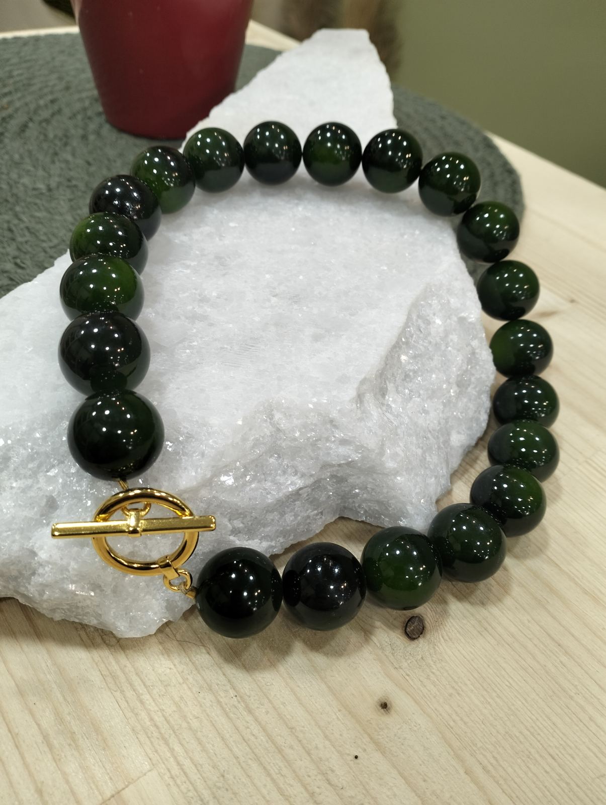 Το κολιέ Emerald Pearl χειροποίητο συνδυάζει τη διαχρονική κομψότητα της πέρλας με μια σύγχρονη, δυναμική αισθητική. Οι μεγάλες πέρλες των 20mm σε βαθύ πράσινο τόνο χαρίζουν ένταση και χαρακτήρα, ενώ το μεταλλικό ζάμακ κούμπωμα με επίχρυση επικάλυψη 24Κ λειτουργεί τόσο πρακτικά όσο και διακοσμητικά.