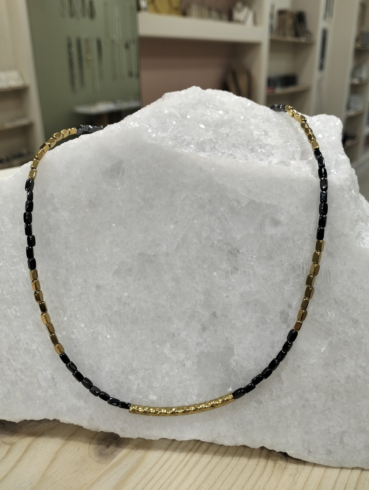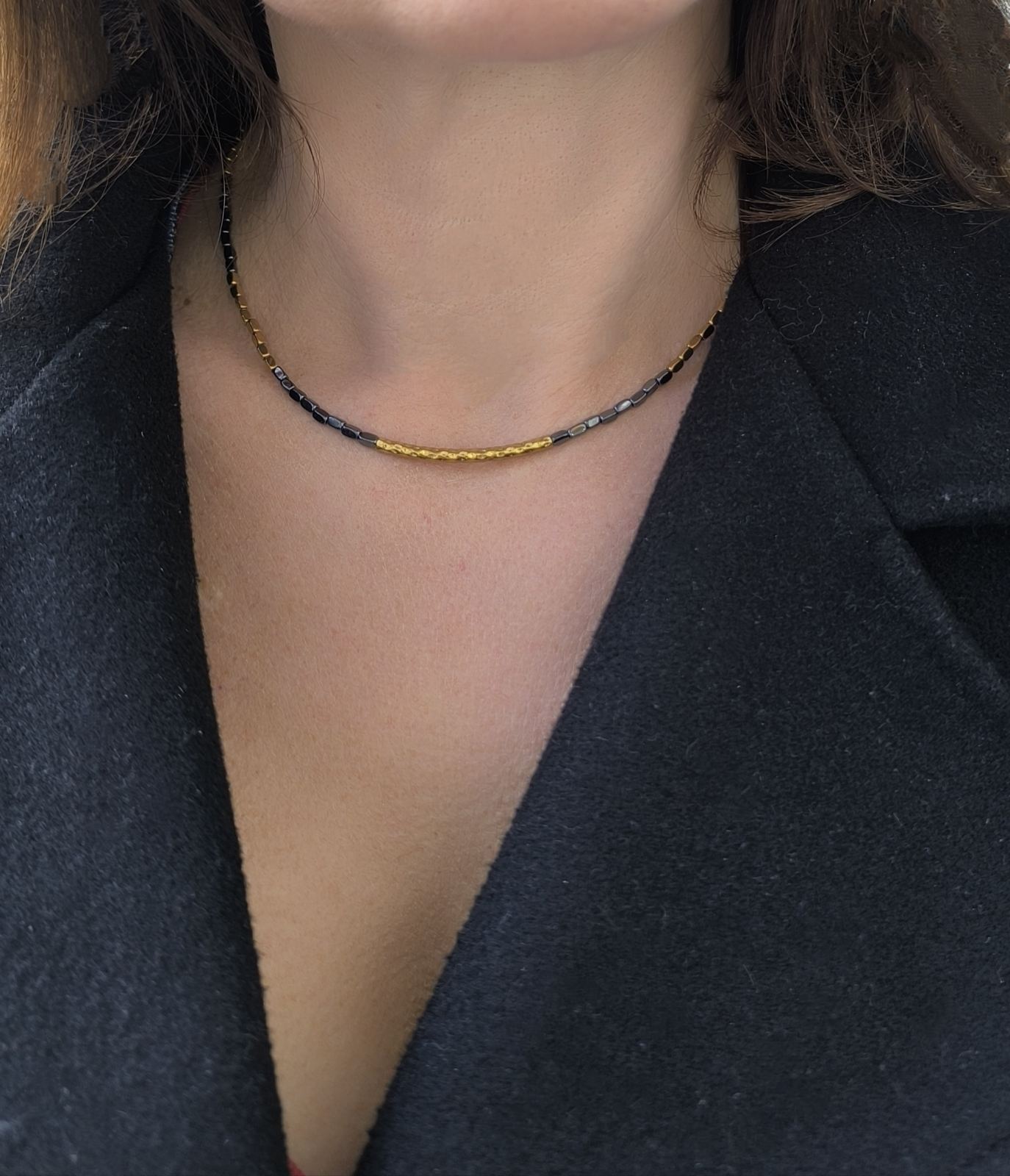 Το κολιέ “Aurum Noir” συνδυάζει τη διαχρονική κομψότητα του χρυσού με τη δυναμική αισθητική του μαύρου αιματίτη, δημιουργώντας ένα κόσμημα που φοριέται εύκολα από το πρωί έως το βράδυ.