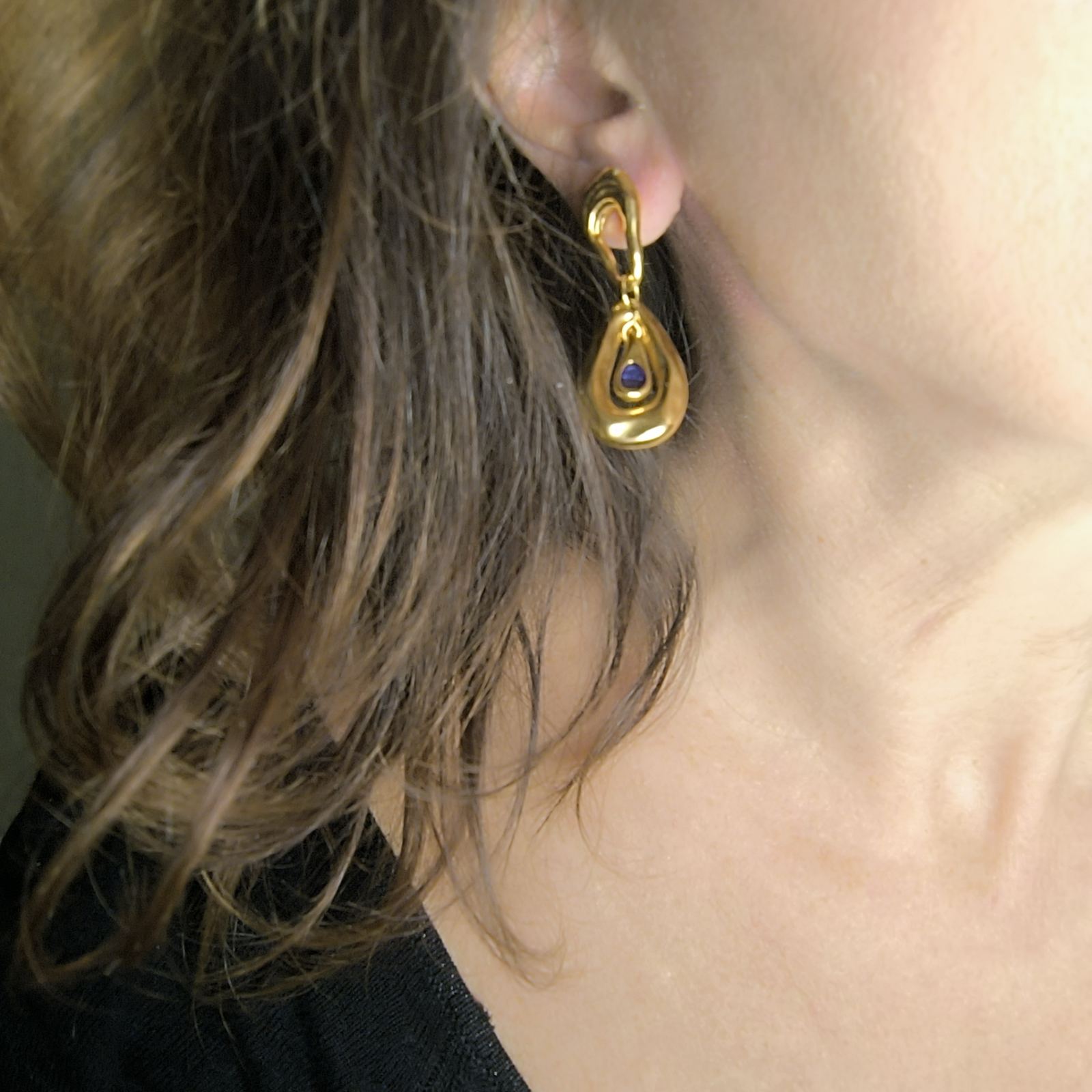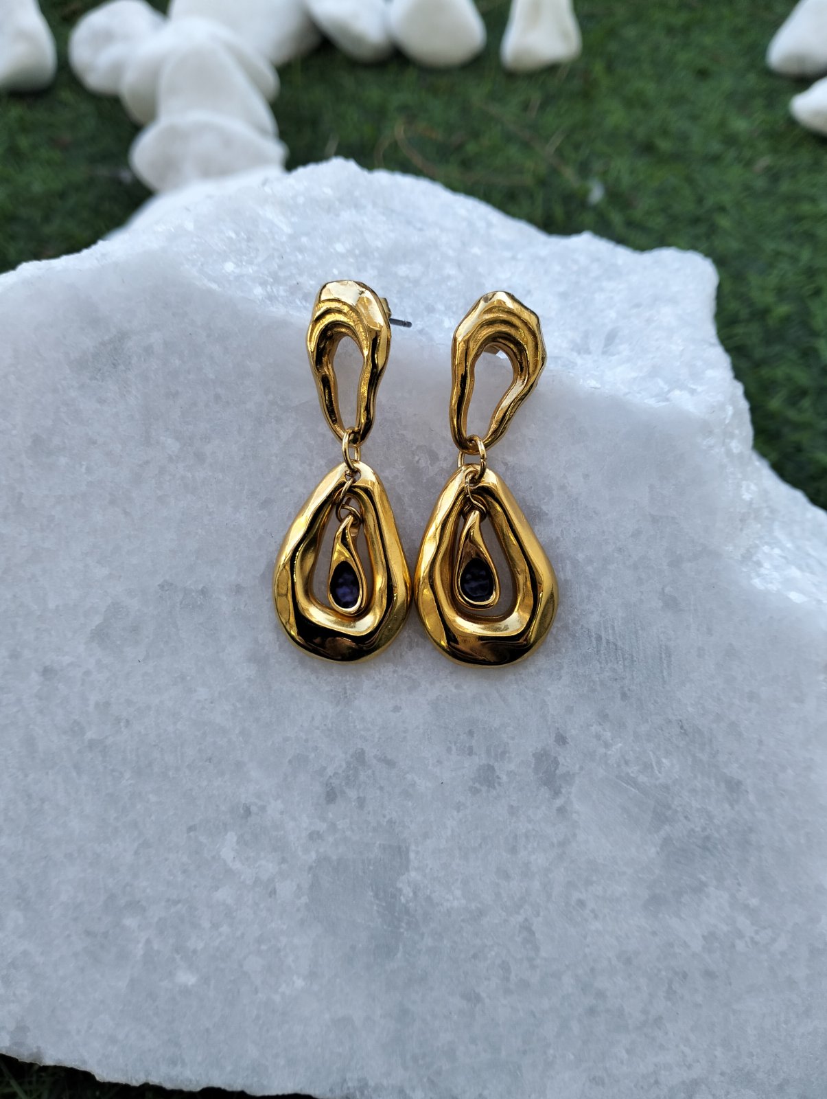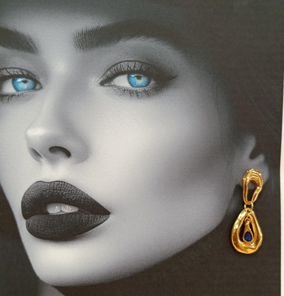 Αναβάθμισε το στυλ σου με αυτά τα μοναδικά κρεμαστά σκουλαρίκια από ζάμακ, επιχρυσωμένα με 24 καράτια χρυσό. Ο ιδιαίτερος συνδυασμός γεωμετρικών σχημάτων και η μπλε λεπτομέρεια δημιουργούν ένα σύγχρονο αλλά διαχρονικό κόσμημα που ξεχωρίζει.