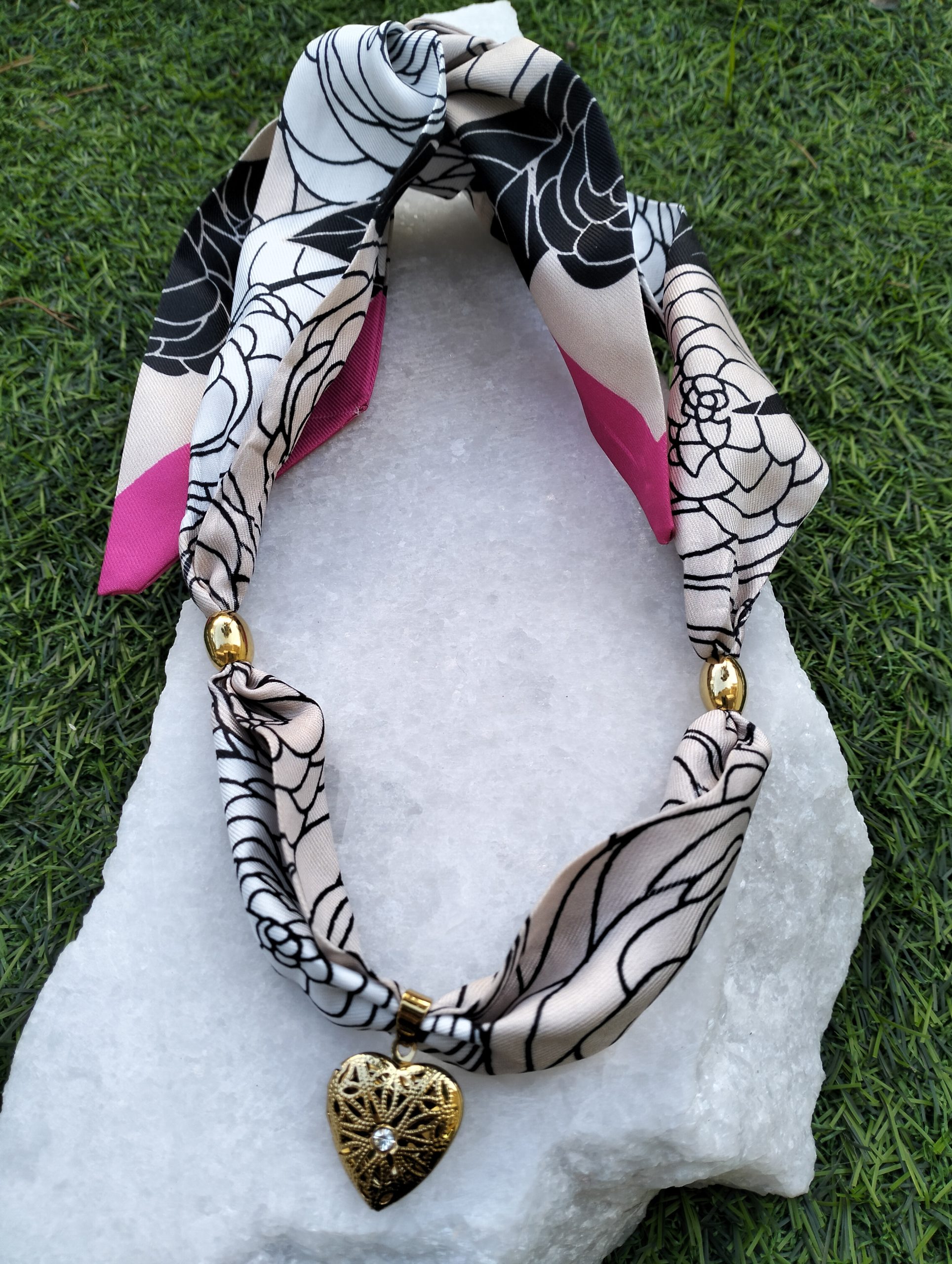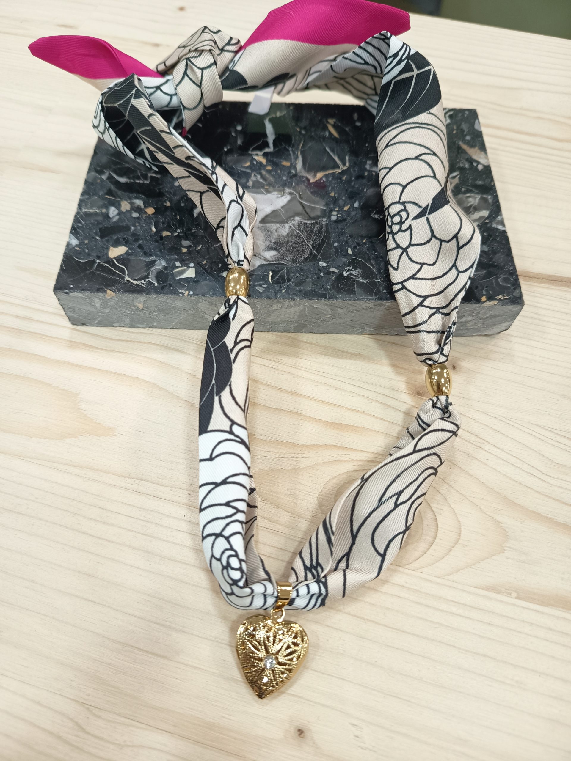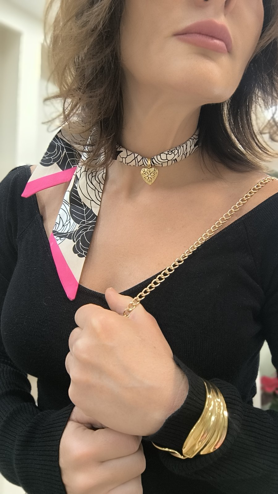 Το “Fuchsia Amore” είναι ένα ρομαντικό και ταυτόχρονα δυναμικό χειροποίητο κολιέ-φουλάρι που ξεχωρίζει για τη χρυσή καρδιά με διακριτική πέτρα στο κέντρο. Η μεταξωτή κορδέλα με ασπρόμαυρο floral μοτίβο και έντονες φούξια λεπτομέρειες δημιουργεί μια κομψή αντίθεση που αναδεικνύει τον λαιμό με θηλυκότητα και στυλ.