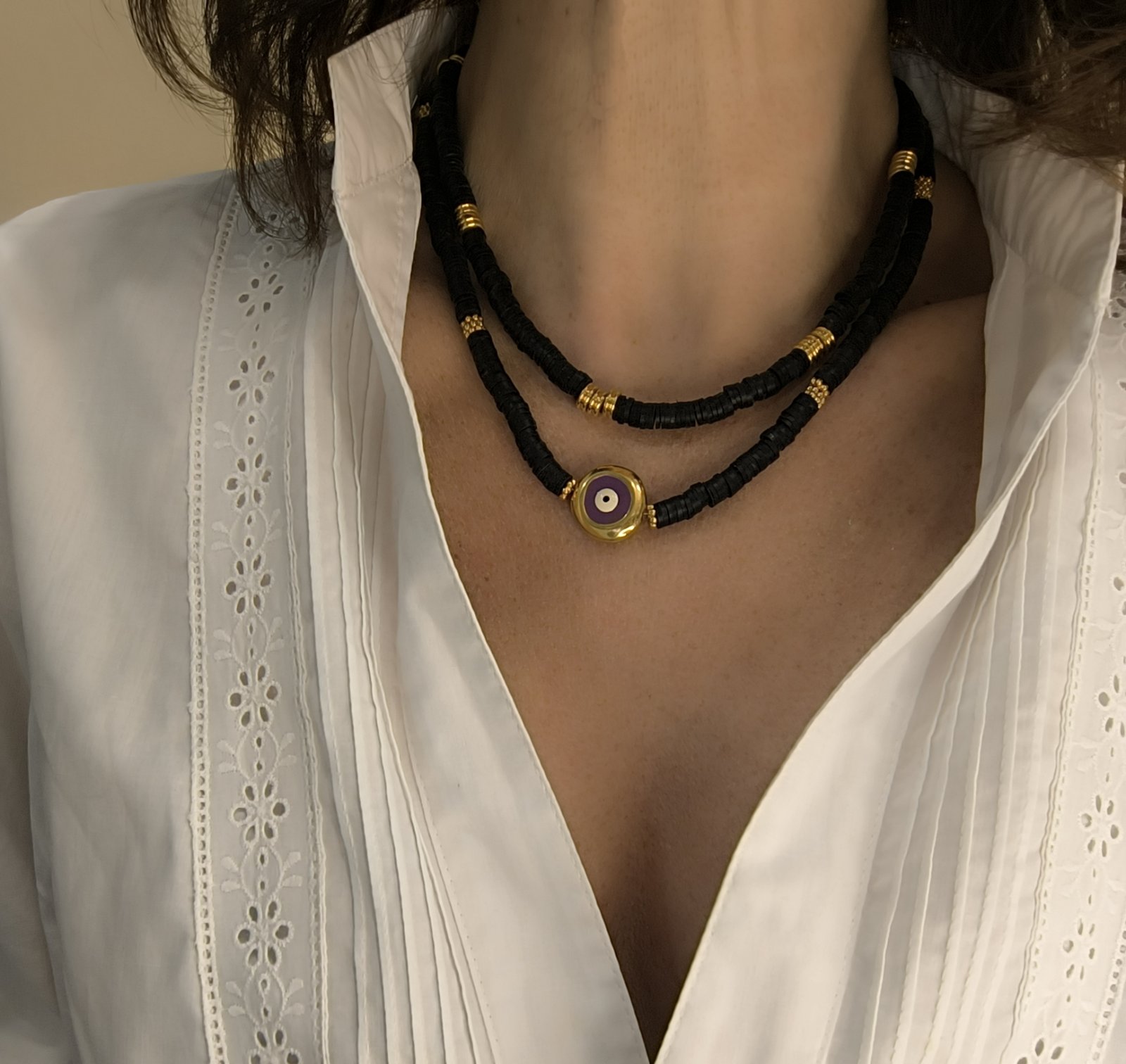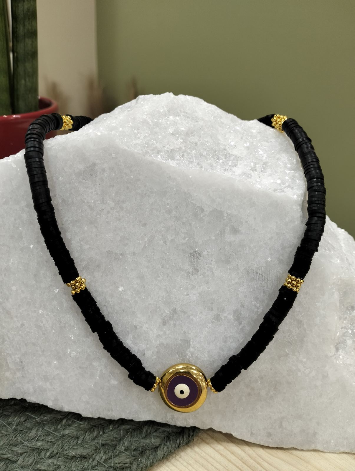 Το δεύτερο κολιέ είναι κατασκευασμένο από μαύρες ροδέλες καουτσούκ και μεταλλική ζάμακ χάντρα λουλούδι επίχρυση με χρυσό 24Κ (5.6×1.4mm), ενώ στο κέντρο δεσπόζει στρογγυλό μεταλλικό ζάμακ στοιχείο με μάτι και μωβ σμάλτο διαμέτρου 19mm.