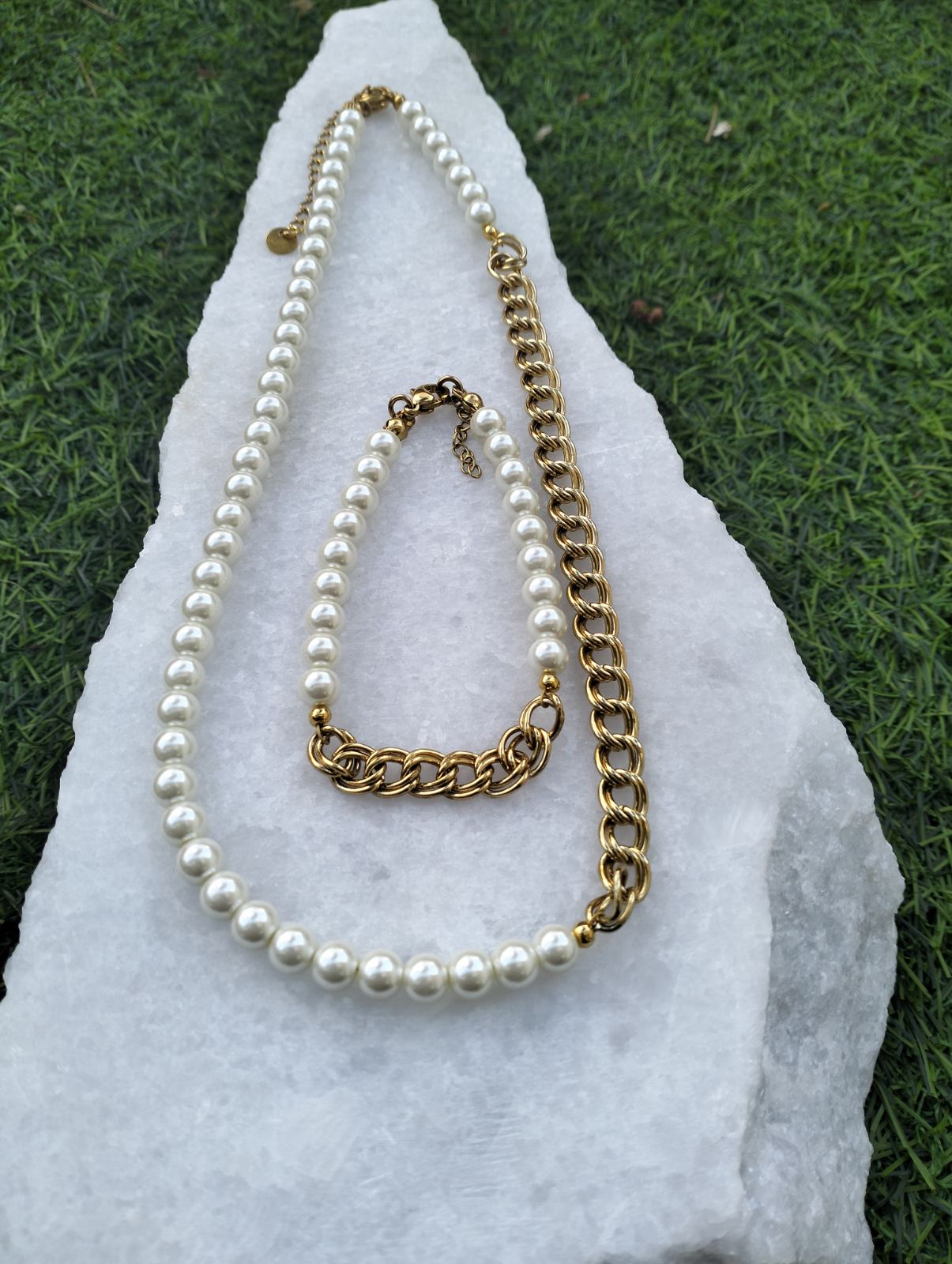 Το σετ “Aurelia Pearl” αποτελείται από κολιέ και βραχιόλι, σχεδιασμένα για να προσθέτουν κομψότητα και φινέτσα σε κάθε εμφάνιση.