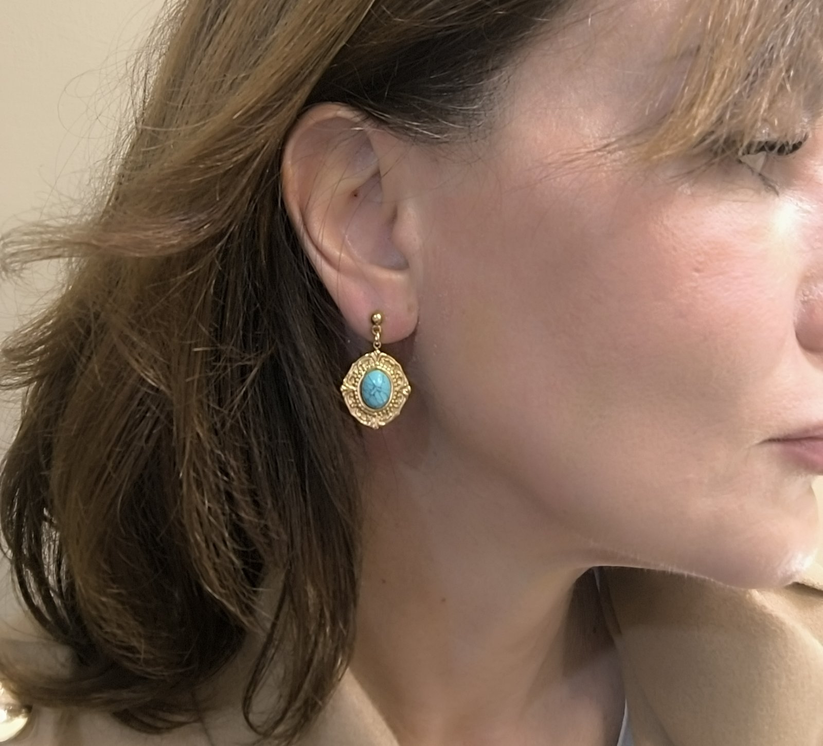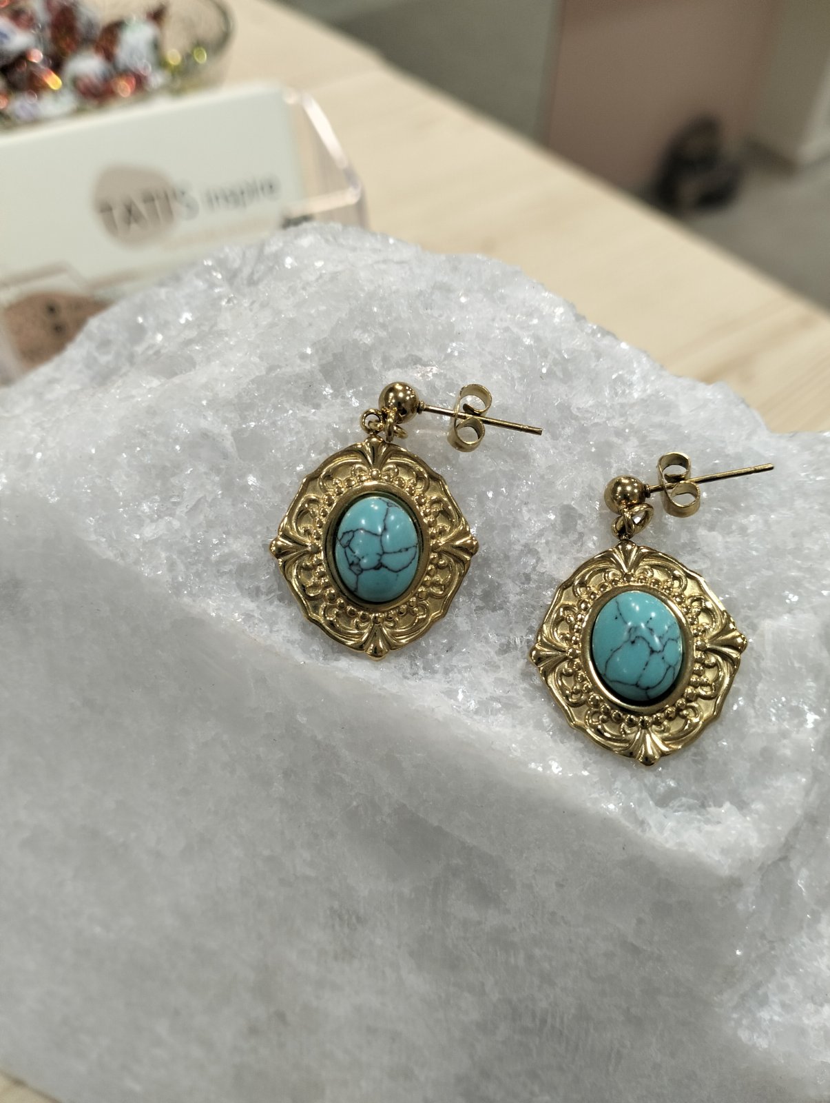 Τα σκουλαρίκια Ariadne συνδυάζουν την κλασική κομψότητα με μια διαχρονική boho αισθητική. Είναι χειροποίητα και κατασκευασμένα από ανθεκτικό ανοξείδωτο ατσάλι, με εντυπωσιακή οβάλ τιρκουάζ πέτρα στο κέντρο, τοποθετημένη σε περίτεχνο, διακοσμητικό πλαίσιο σε χρυσό τόνο.