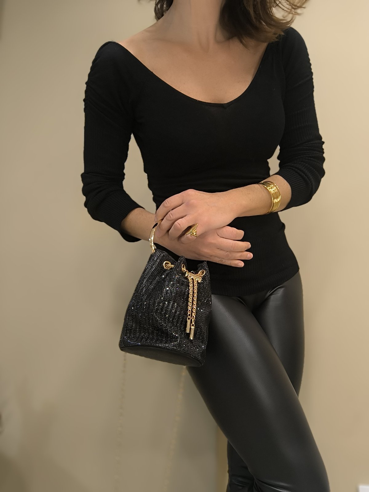Το μεταλλικό χερούλι σε χρυσό τόνο προσθέτει χαρακτήρα και σταθερό κράτημα, ενώ η αποσπώμενη αλυσίδα ώμου σου δίνει τη δυνατότητα να τη φορέσεις και χιαστί ή στον ώμο. Το σχέδιο πουγκί κλείνει με μεταλλικό κορδόνι, κρατώντας τα προσωπικά σου αντικείμενα ασφαλή με στυλ.
