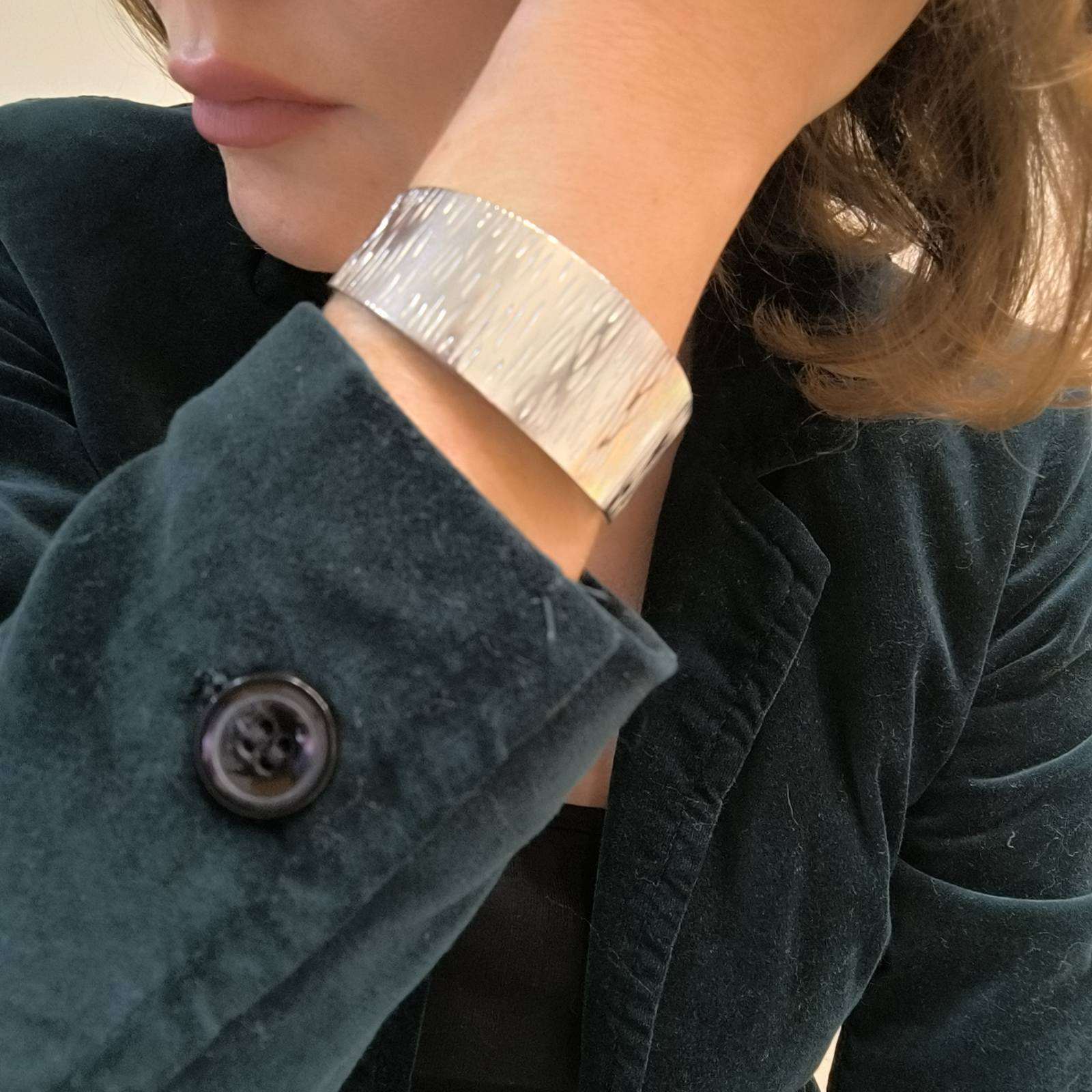 Κομψές ατσάλινες χειροπέδες με ιδιαίτερη κυματιστή, ανάγλυφη υφή που αντανακλά το φως και χαρίζει μοναδική λάμψη σε κάθε κίνηση.