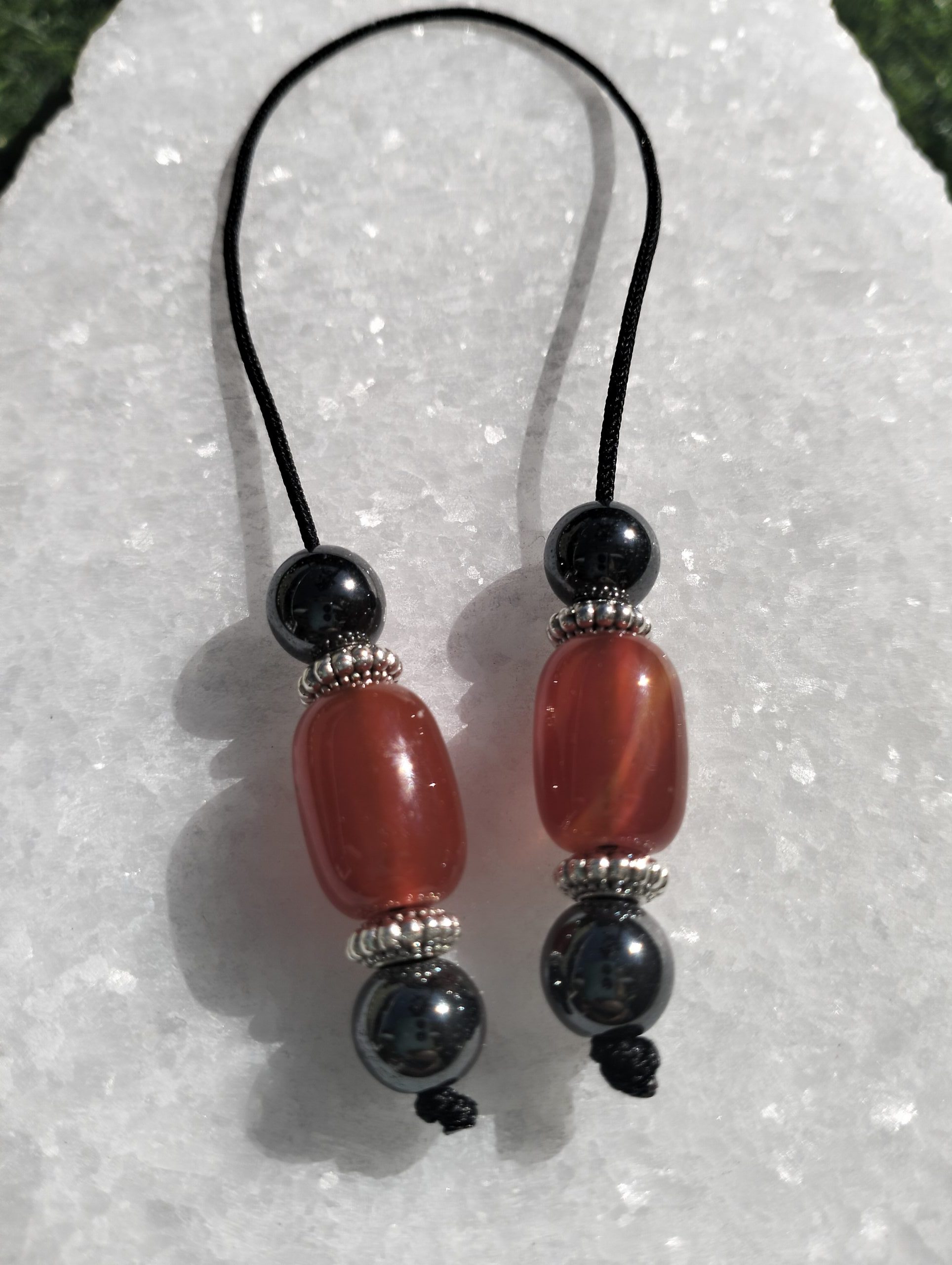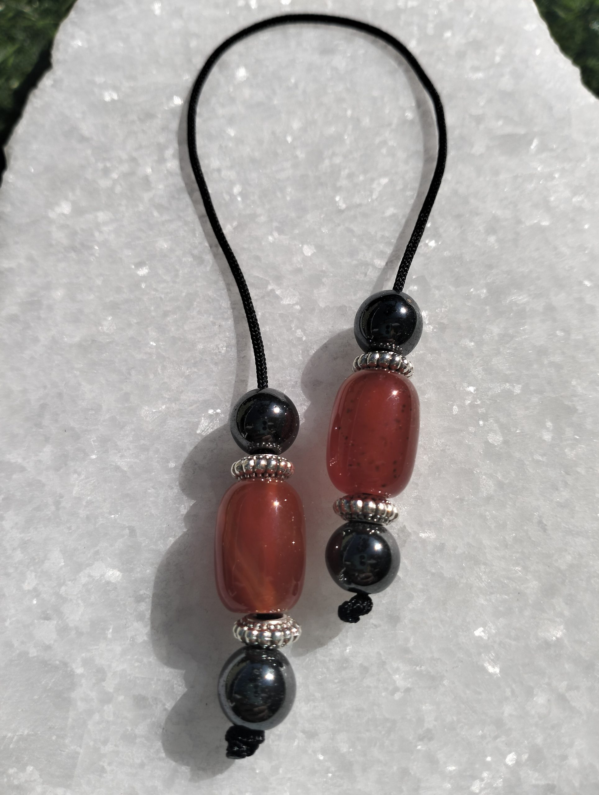 Χειροποίητο μπεγλέρι με ημιπολύτιμες πέτρες αχάτη σε ζεστή κόκκινη απόχρωση, συνδυασμένες με αιματίτη σε σκούρο μεταλλικό τόνο.
