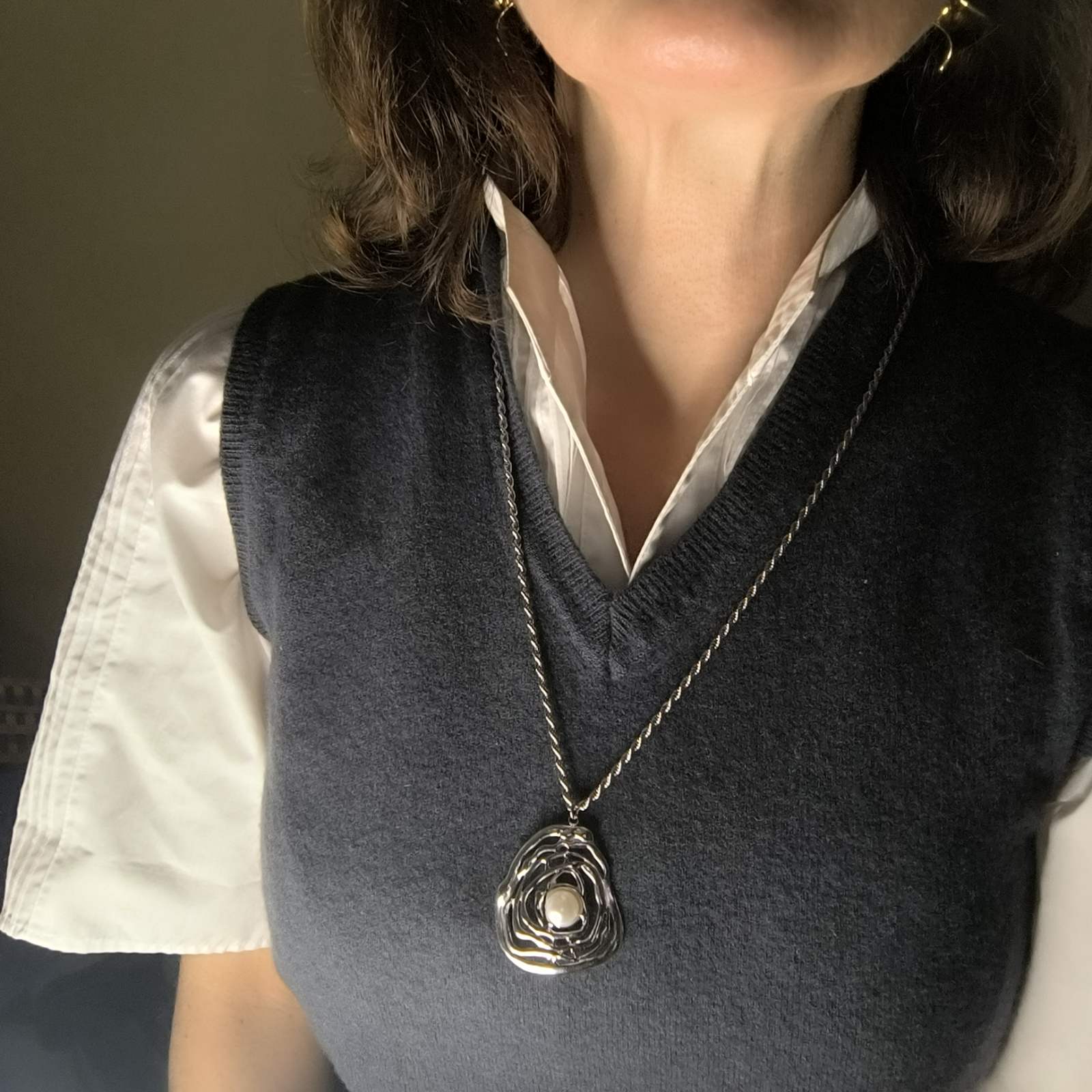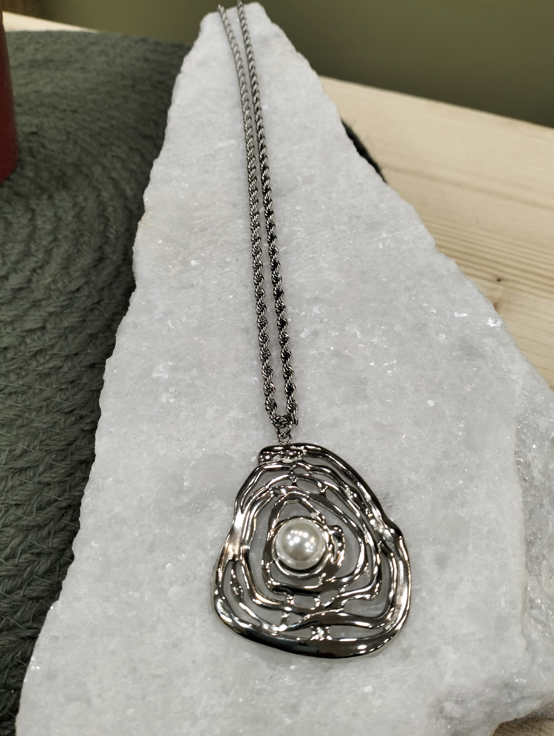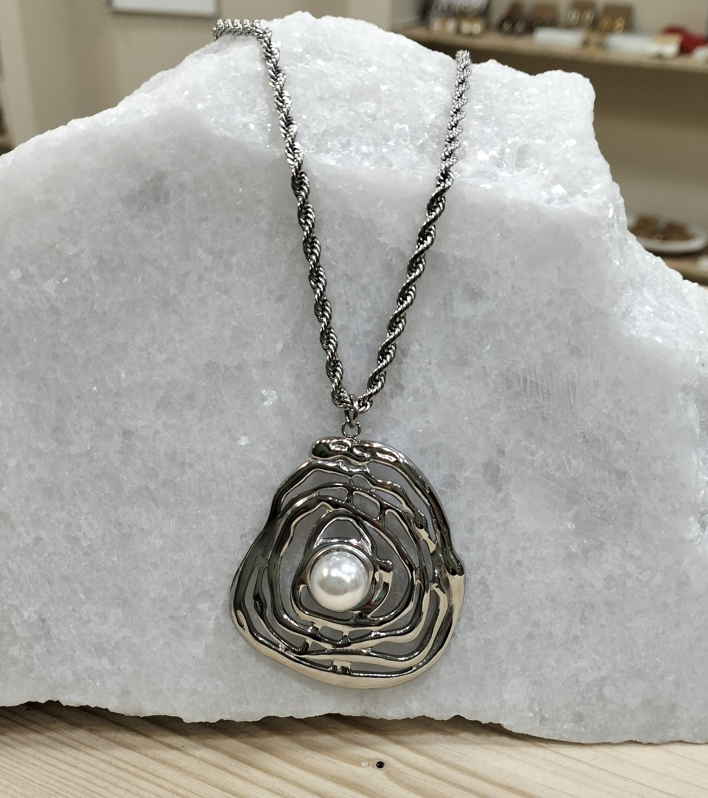 Χειροποίητο κολιέ από ανοξείδωτο ατσάλι, με μενταγιόν σε ρευστό, φυσικό σχέδιο που αγκαλιάζει μια πέρλα στο κέντρο.