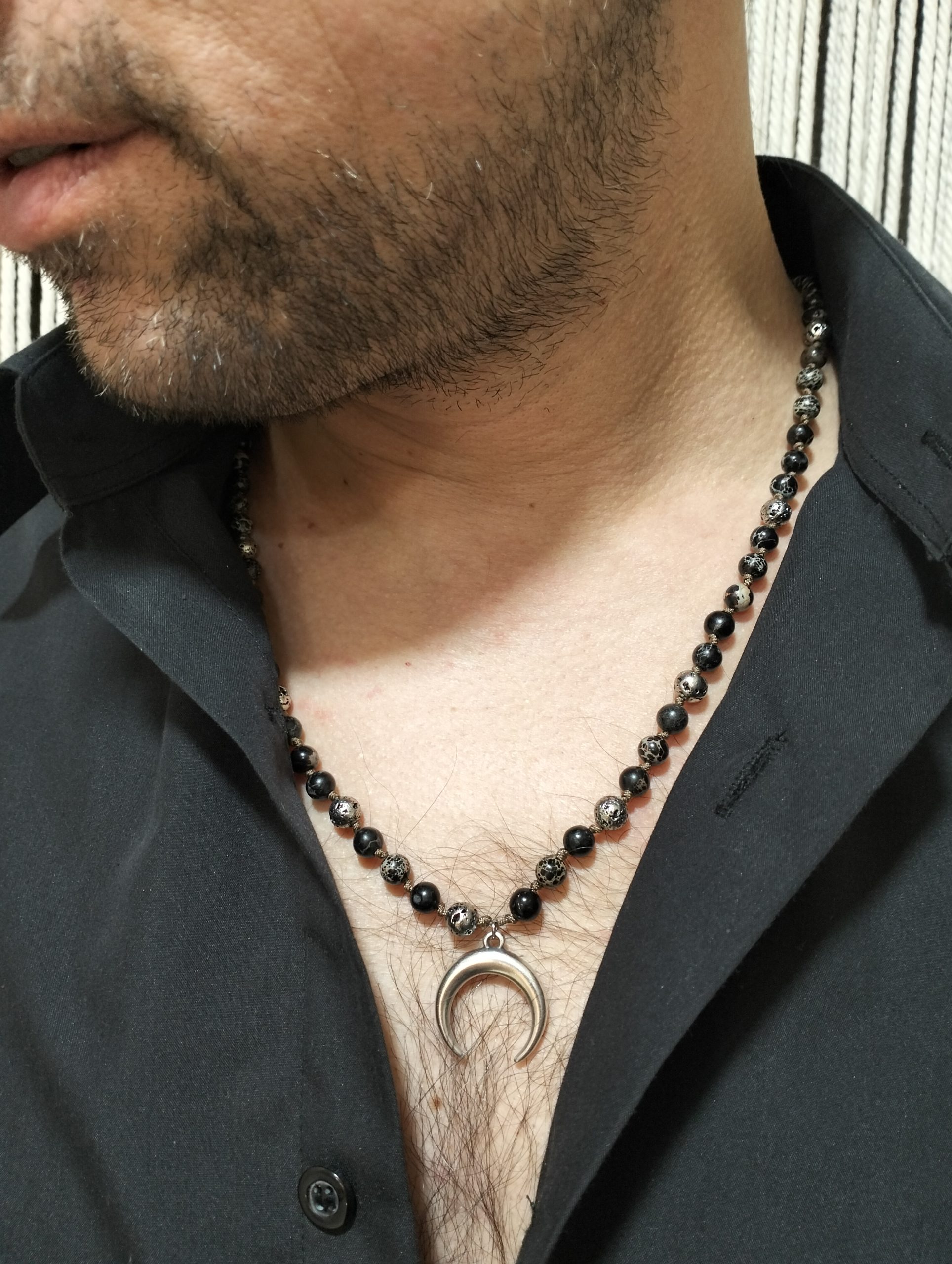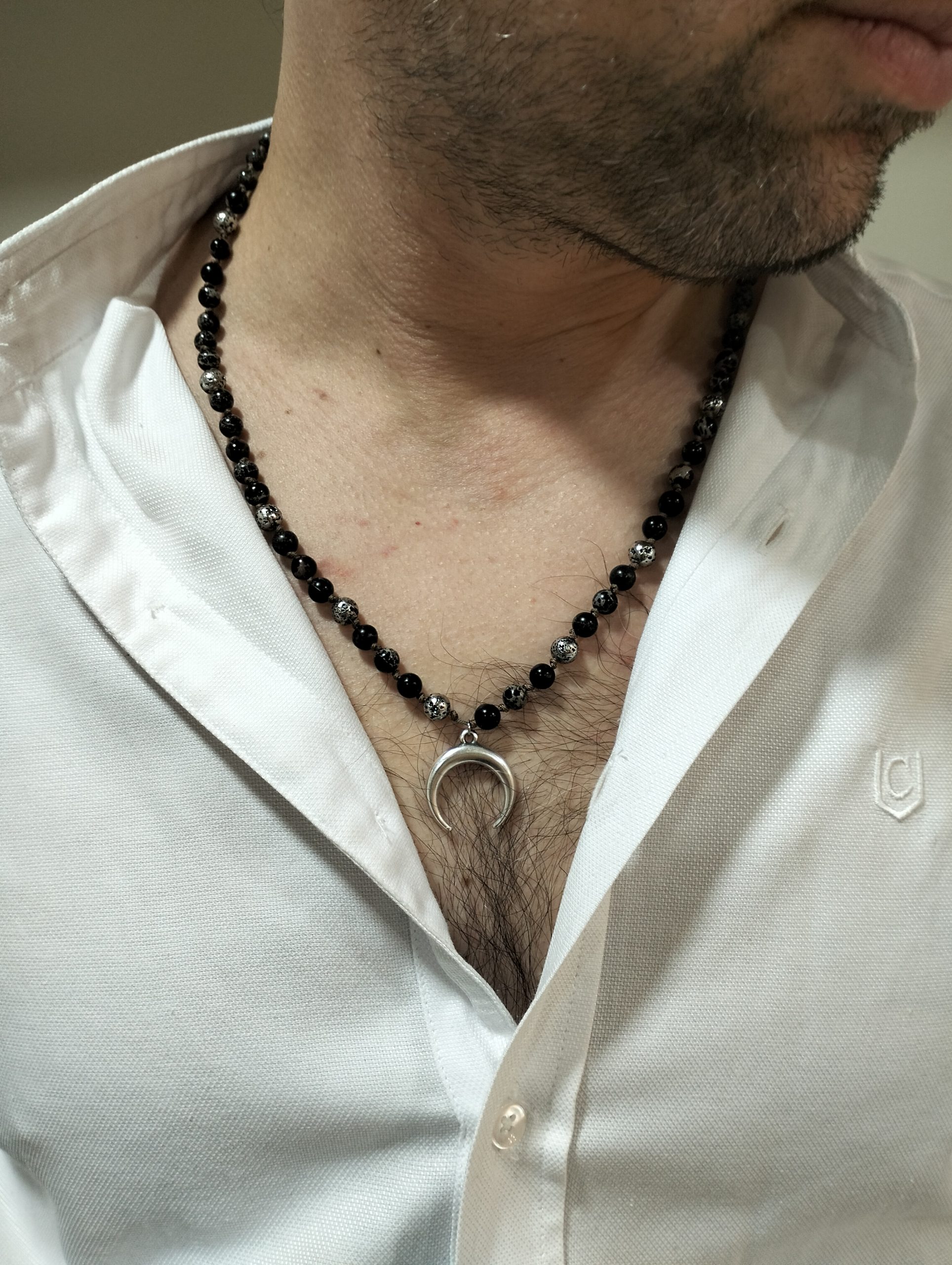 Το κεντρικό μοτίφ είναι επάργυρο αντικέ κόκκαλο φεγγάρι διαμέτρου 23mm, σύμβολο κύκλων, ισορροπίας και εσωτερικής δύναμης. Το φυσικό χρώμα των υλικών σε συνδυασμό με το αντικέ φινίρισμα δημιουργούν ένα διαχρονικό κόσμημα που φοριέται εύκολα από το πρωί έως το βράδυ.