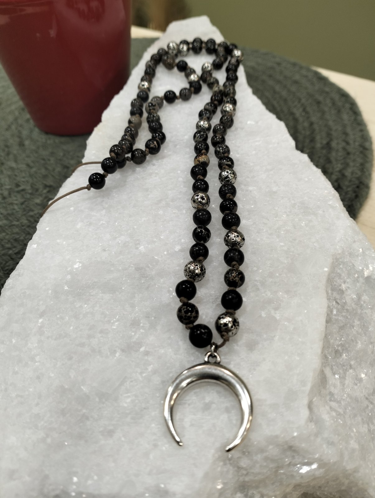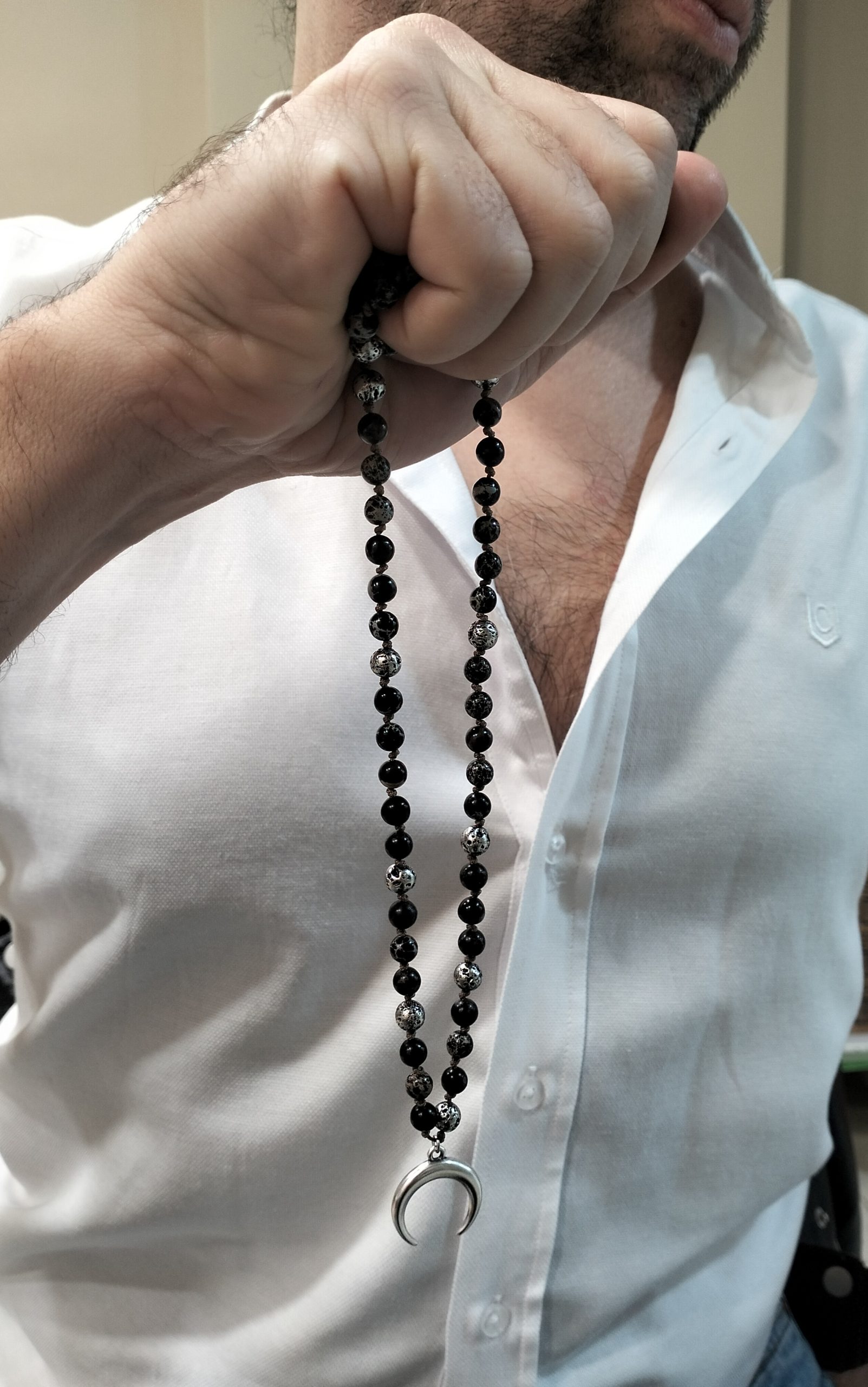 Το LUNAR είναι ένα χειροποίητο κολιέ τύπου ροζάριο με έντονο συμβολικό και μυστικιστικό χαρακτήρα. Αποτελείται από ημιπολύτιμες χάντρες, με ενδιάμεσα στοιχεία από λάβα αιματίτη διαμέτρου 6mm, δεμένες σε ανθεκτικό καφέ κορδόνι μακραμέ με ρυθμιζόμενο μήκος.