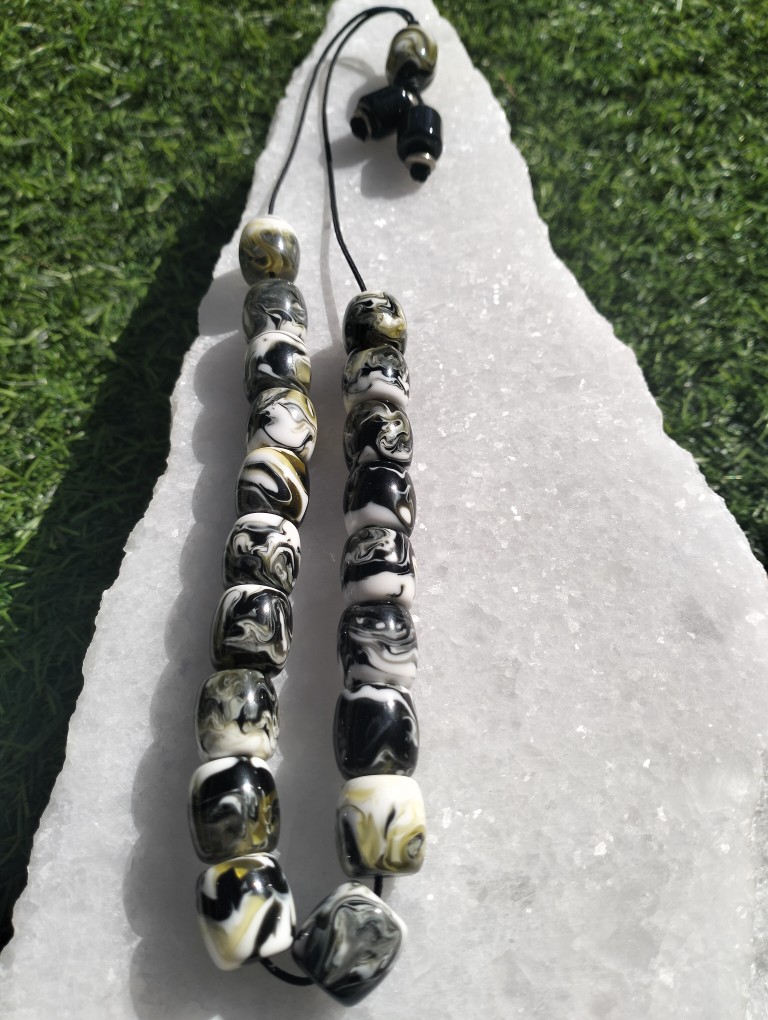 Χειροποίητο κομπολόι με εντυπωσιακές χάνδρες ρητίνης σε μαύρο, λευκό και χακί, με έντονο μαρμαροειδές σχέδιο που δημιουργεί μοναδικούς συνδυασμούς σε κάθε κομμάτι.