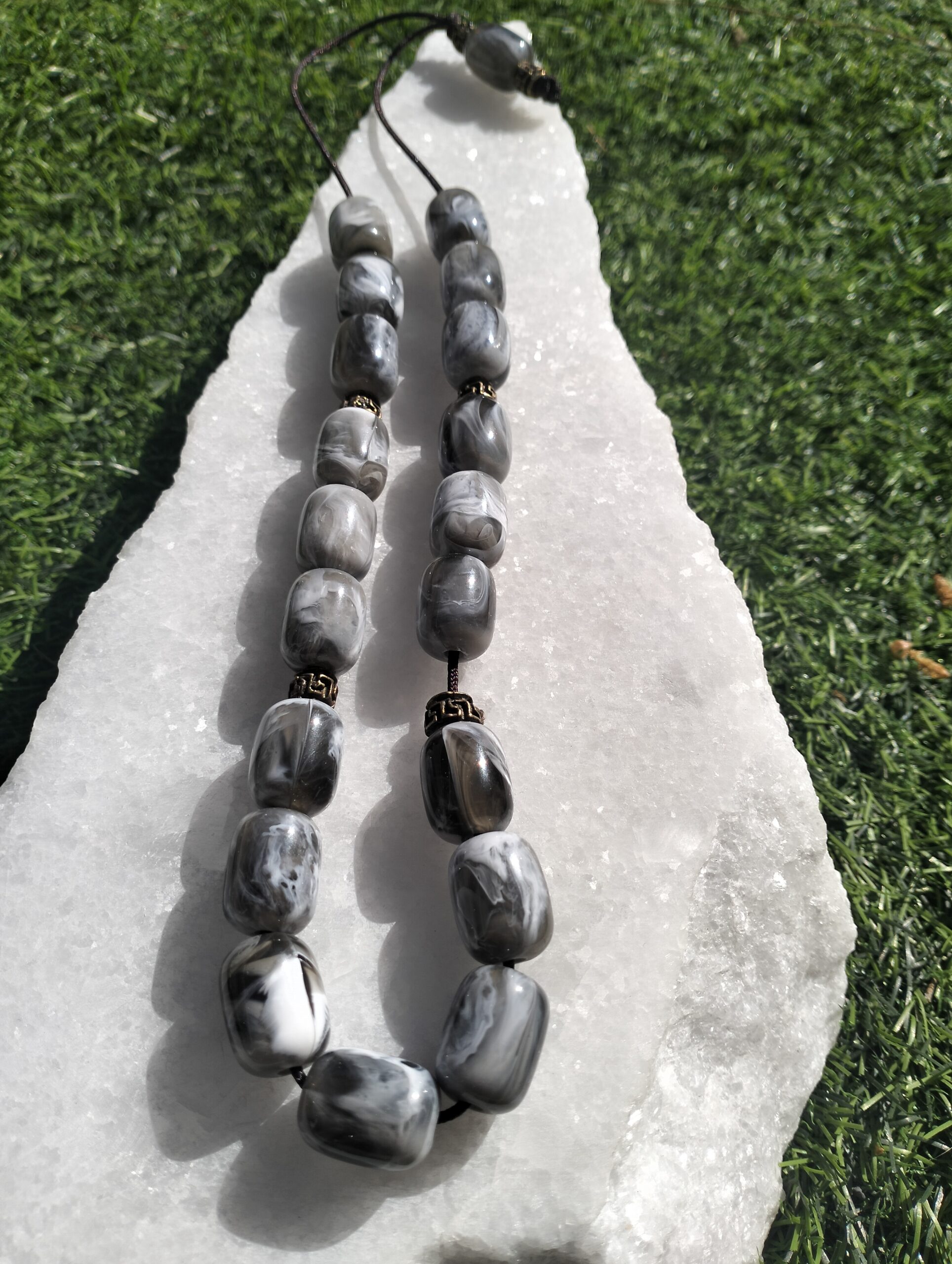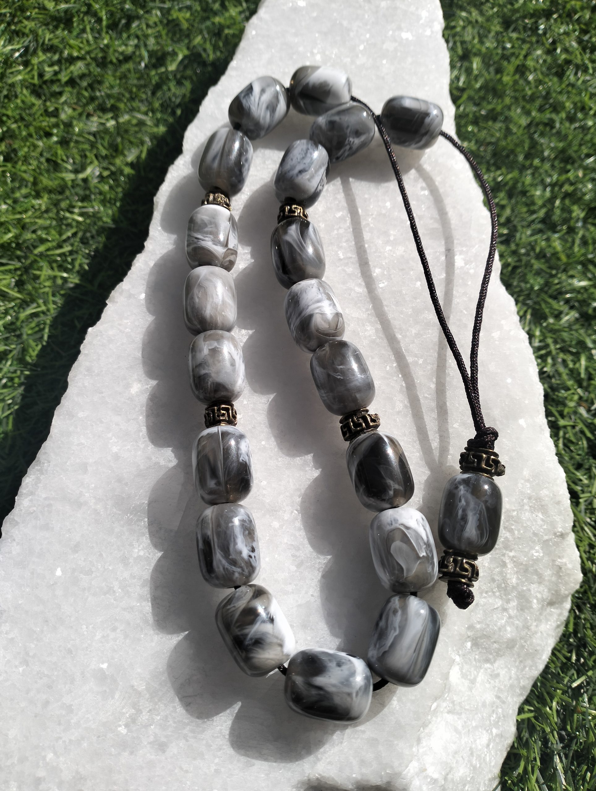 Χειροποίητο κομπολόι με εντυπωσιακές χάνδρες ρητίνης σε γκρι και μαύρες αποχρώσεις, με μαρμαροειδές σχέδιο που θυμίζει φυσική πέτρα.